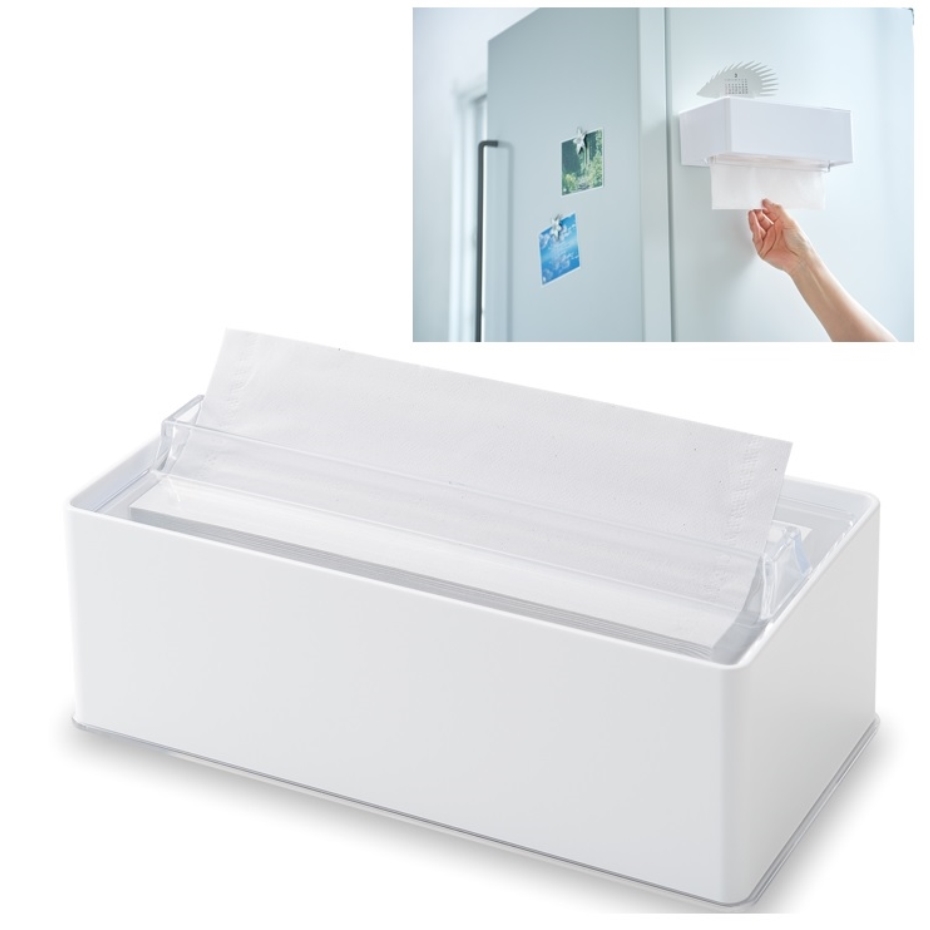 【マグネットで取り付けて、ペーパータオルを下から取り出し、置き式として上から取り出しの二通りの使い方ができます】