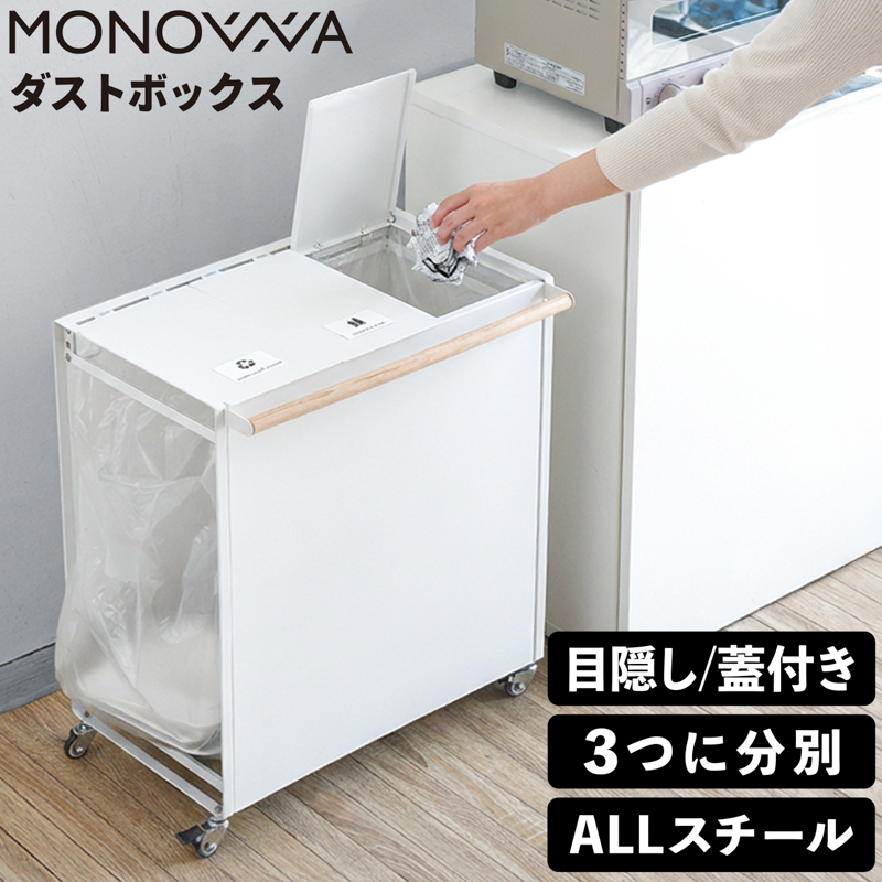 | フタ付きで、スッキリ隠せる 分別ができる、「箱のない」ゴミ箱。 ●3種類のゴミをまとめて分別。 ●様々なサイズの袋がかけられる。 ●フタ付きで、臭い漏れを軽減。 ●袋の取っ手をフレームに引っ掛けるだけ。 ●捨てる場所が一目でわかる、分別ステッカー5枚付き。 ●後ろから取り出せるので、いっぱいになっても大丈夫。 ●サビや黄変に強いスチール素材を採用。マグネットもピタッと。 ●使い方いろいろ。ライフスタイルになじむシンプルなデザイン。 暮らしを便利にしてくれるデザインシリーズ「monowa(モノワ)」から、フタ付きの分別ダストボックスが登場! 【満足の耐荷重約80kg】※合計 ゴミの分別、していますか?燃えるごみ、ペットボトル、お肉のトレーなどの資源プラスチックごみなど、分別して捨てなくてはいけないものはたくさんあります。monowa097フタ付き分別ダストボックスなら、3つのゴミ袋が入るから、いろいろなゴミを1箇所でまとめて分別できます。 | |