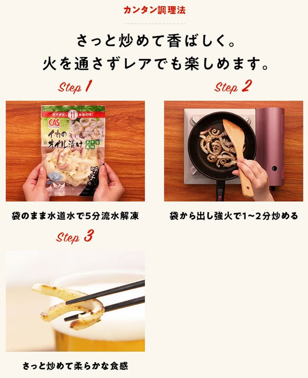 呼子産の新鮮なイカを、ネギ塩風味の特製タレに漬け込んでいます。解凍後に強火でさっと炒めて風味と食感をお楽しみください。火を通さずレアでも美味しくいただけます。パーティーや晩酌のおつまみに最適です。