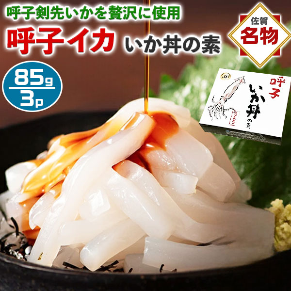 ■内容量: 名称:いか丼の素 3個セット | 1個約85g(内容量:いか70g・たれ15g)|原材料名:【いか】剣先イカ(玄界灘)(一部にイカを含む)【添付たれ】醤油(国内製造)、砂糖、米発酵調味料、昆布エキス、かつおエキス、食塩、かきエキス、魚醤/調味料(アミノ酸等)(一部に小麦・さば・大豆を含む)|保存方法:要冷凍(-18℃以下で保存)凍結前加熱の有無:加熱してありません。加熱調理の必要性:加熱調理の必要はありません|※解凍後はお早めに、お召し上がりください。|販売者:JF佐賀玄海漁業協同組合 呼子CASセンター 佐賀県唐津市呼子町呼子740番地12