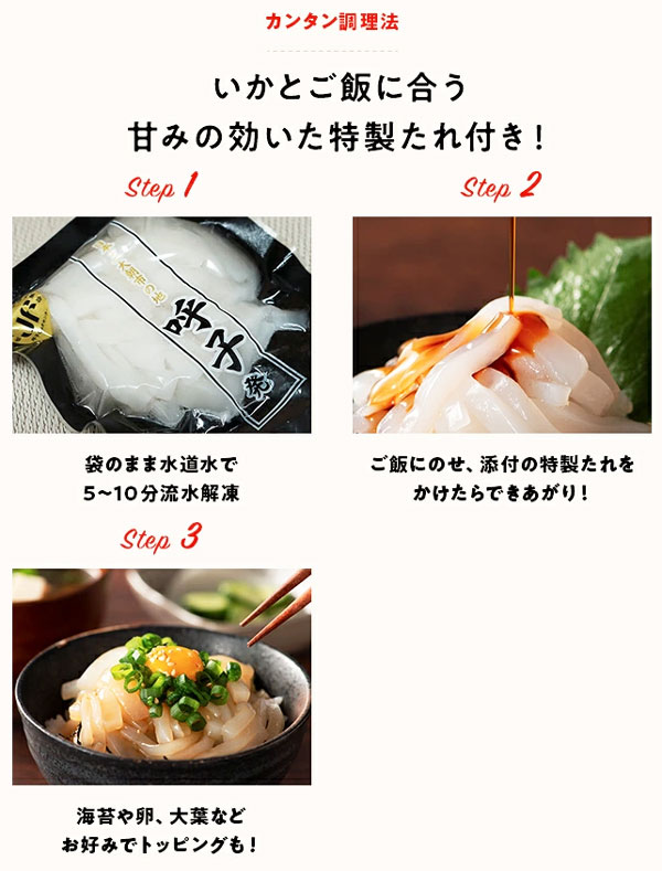 ■コメント: 呼子名産の剣先イカを、本来の「旨味・香り・みずみずしさ」を保てる最新のCAS凍結で瞬間凍結したいか丼の素です。噛むたびに甘みが出て、コリコリとした食感が味わえます。いかとご飯に合う甘みの効いた特製たれ付き。袋のまま流水解凍したいかをご飯にのせ、特製たれをかけてお召し上がりください。お好みで大葉や卵、海苔をトッピングするとより美味しくお召し上がりいただけます。