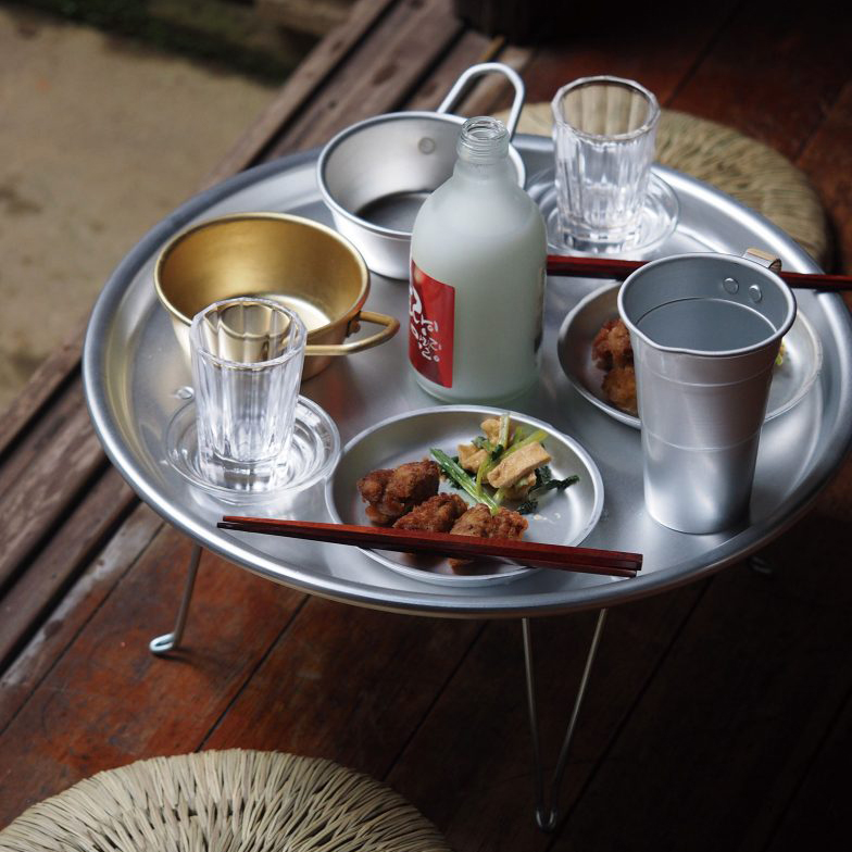韓国では一般的なアルミ製のちゃぶ台。足を折り畳めばお盆としても使用できます。