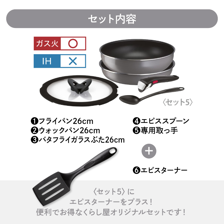 JAN:セット5 3168430349124 ターナー:3168432743890 フライパン 26cm 取っ手 蓋 キッチンツール セット フライパンセット 鍋 鍋セット 一式 6点セット インジニオ 26センチ 26cm 26センチ ウォックパン 深型フライパン ディープパン マルチパン 炒め鍋 深型 深い 深め ふた フタ ガラス蓋 ガラスぶた 中身が見える 専用取っ手 スプーン ツール 付き ガス ガス火 直火 コンロ ガスコンロ オーブン キッチン 台所 調理 料理 食洗器 食洗機 対応 丈夫 耐久性 長持ち こびりつきにくい チタン コーティング 使いやすい 炒めやすい お知らせマーク そのまま 直接 冷蔵庫 保存 保管 食卓 ダイニング 並べる 片手 ワンタッチ スピーディー スムーズ 素早く 重ねて 収納 キッチン用品 キッチングッズ ごはん ご飯 自炊 おしゃれ シンプル 定番 かっこいい プレゼント ギフト 贈り物 贈答 お祝い お礼 結婚 新築 引っ越し 母の日 父の日 敬老の日 誕生日 卒業 就職 T-fal 取っ手の取れる 取っ手が取れる これさえあれば 一括 揃う 揃える 初心者 初めて 買い足し 買い替え 便利 万能 フランス製 アルミ 樹脂 グレー 灰色 オンライン 限定 ラッピング無料 包装無料 送料無料