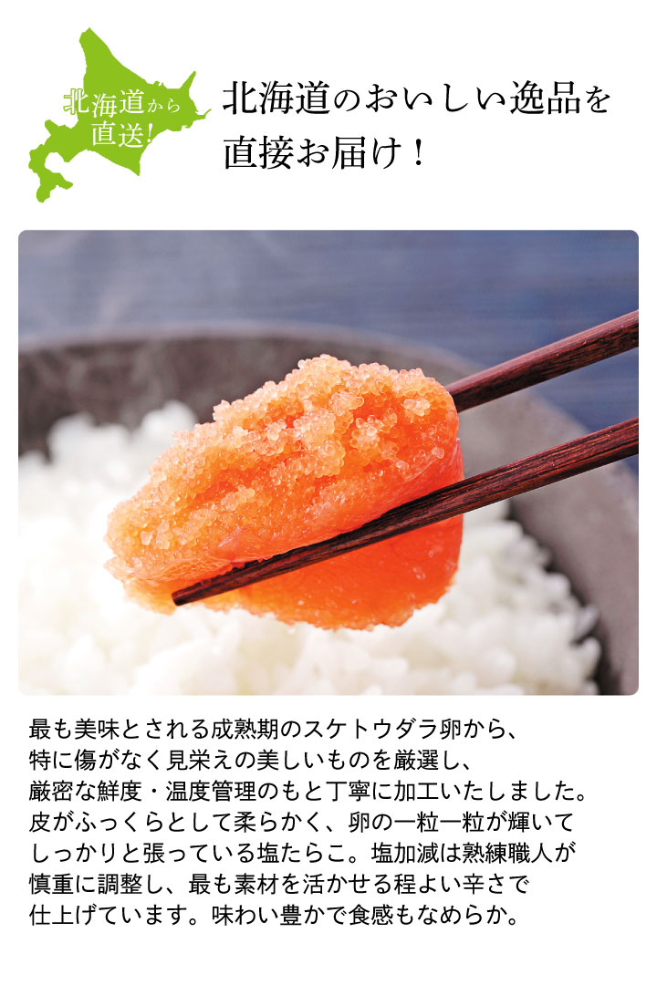 Point!●最も美味とされる成熟期のスケトウダラ卵から、特に傷がなく見栄えの美しいものを厳選し、厳密な鮮度・温度管理のもと丁寧に加工いたしました。