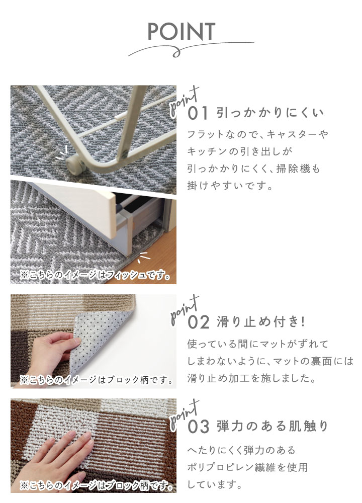 Point!●パイル部がフラットなので、掃除機がかけやすく、キャスターやキッチンの引き出しが引っ掛かりにくい。