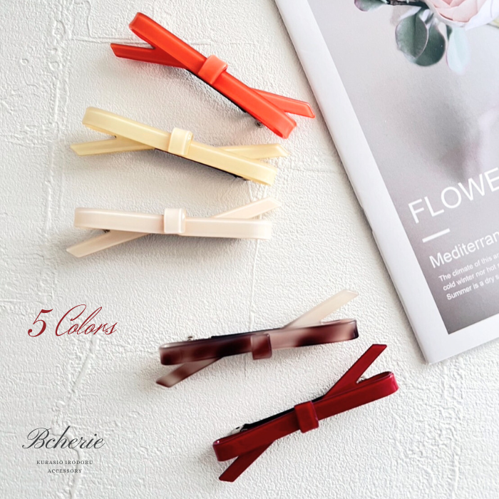 可愛いリボンの形をしたバレッタ。光沢感があり立体的な作りのリボンはヘアスタイルのアクセントに。