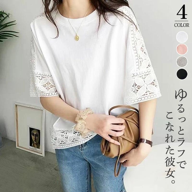【一部即納 】tシャツ Tシャツ レディース 半袖 カットソー ブラウス 2点購入で5%OFF シンプル レース 刺繍 トップス 着痩せ オフィス 通勤 きれい ゆったり