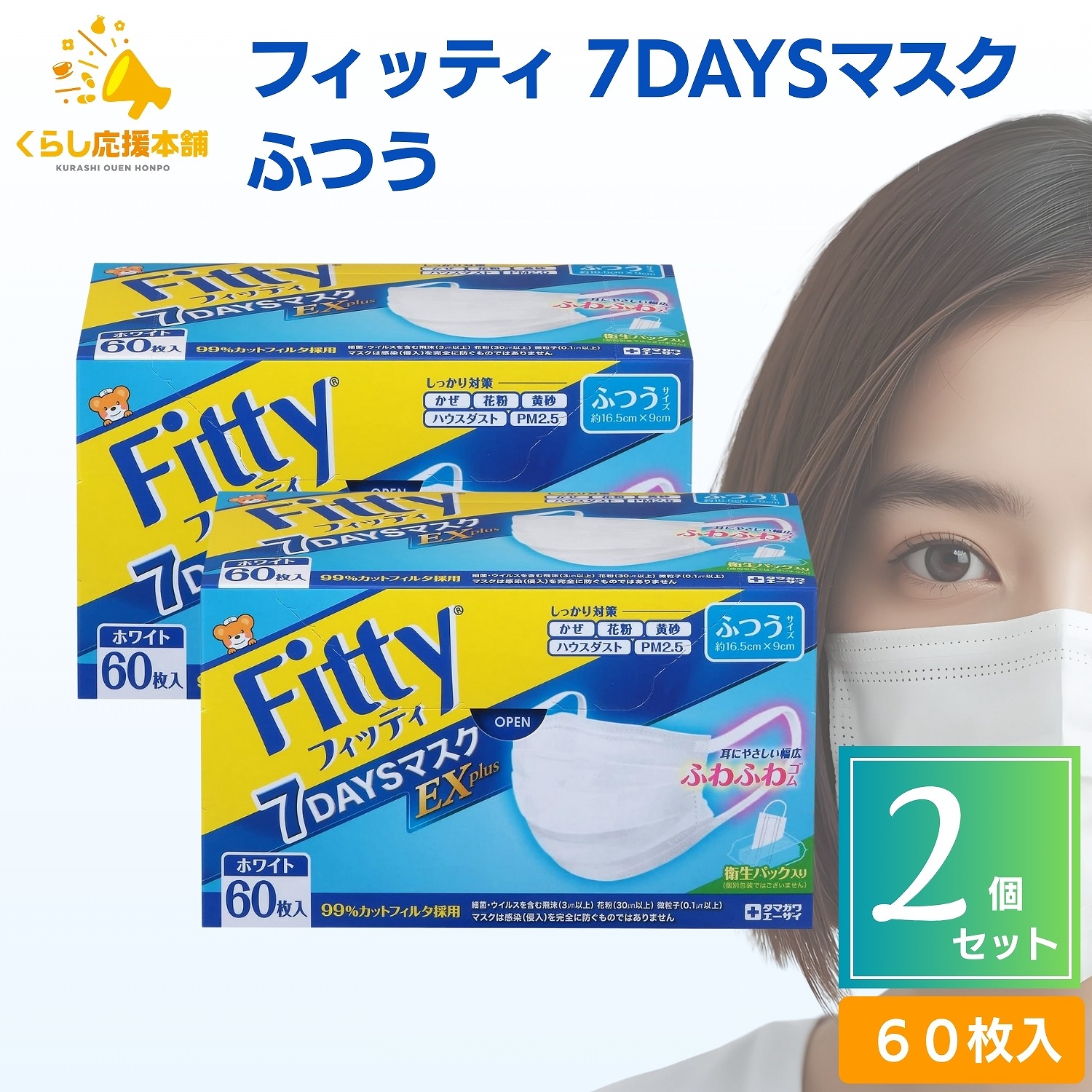 【2個セット】フィッティ 7DAYSマスク EXプラス ふつう 60枚入 送料無料 耳ゴムふわり ホワイト ふつう 60枚入 Fitty 耳ゴムふわり fitty 耳 痛くない 白 使い捨てマスク ふつう 普通 サイズ 不織布 フィッティー 肌荒れ 立体 60枚 風邪 花粉 ほこり 玉川衛材 男女兼用