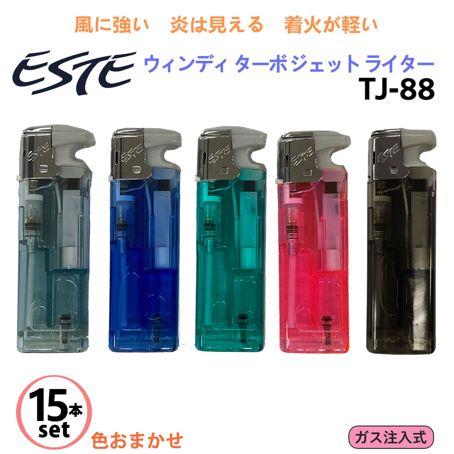 【15本セット/色指定不可】ESTE ウィンディ ターボ ジェット ライター 15本組 TJ-88‐ガス注入式ライター TURBO-JET LIGHTER 色選択不可 ツインライト TJ88