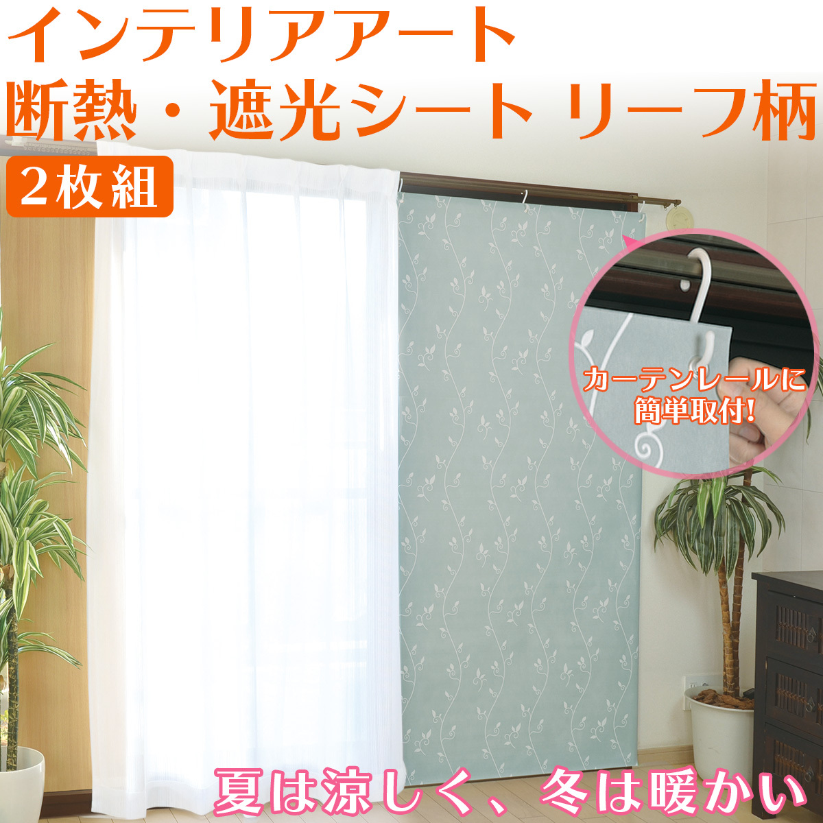防寒 節約 断熱シート インテリアアート 遮光 リーフ柄 2枚組‐工事不要 工具不要 西日 節電 アルミカーテン 暖気遮断 遮光率100% フリーカット 日除け 目隠し