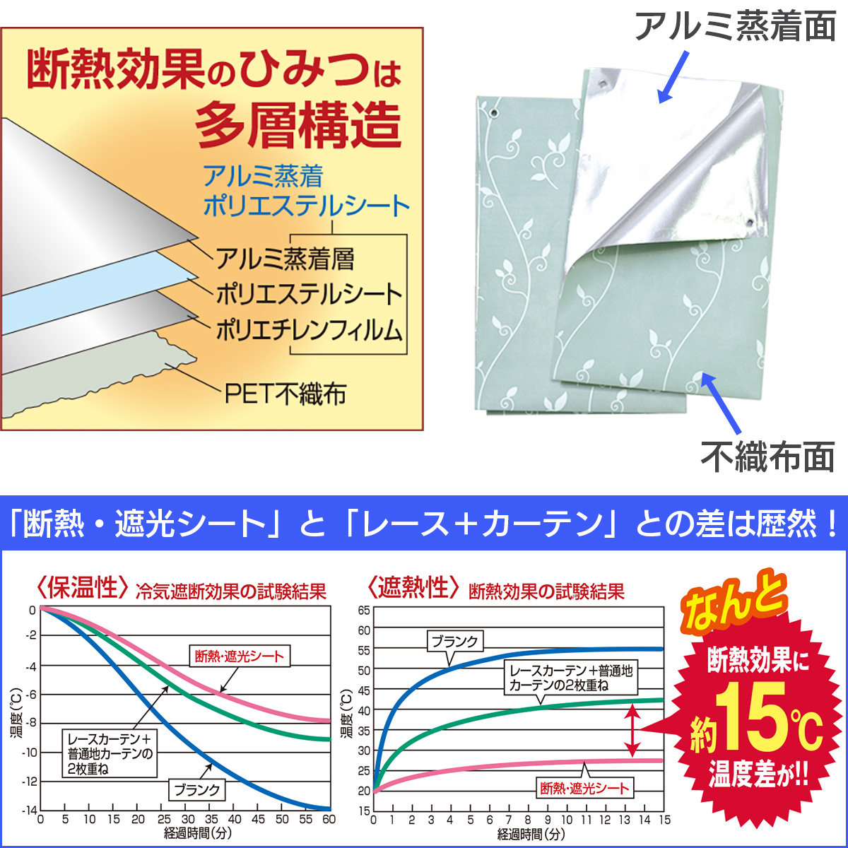 遮熱性・遮光性に優れたアルミ層が、夏場の強い日差しやムッとする熱気、冬場はこごえる様な冷気からお部屋を守り冷暖房効果もUPします。
