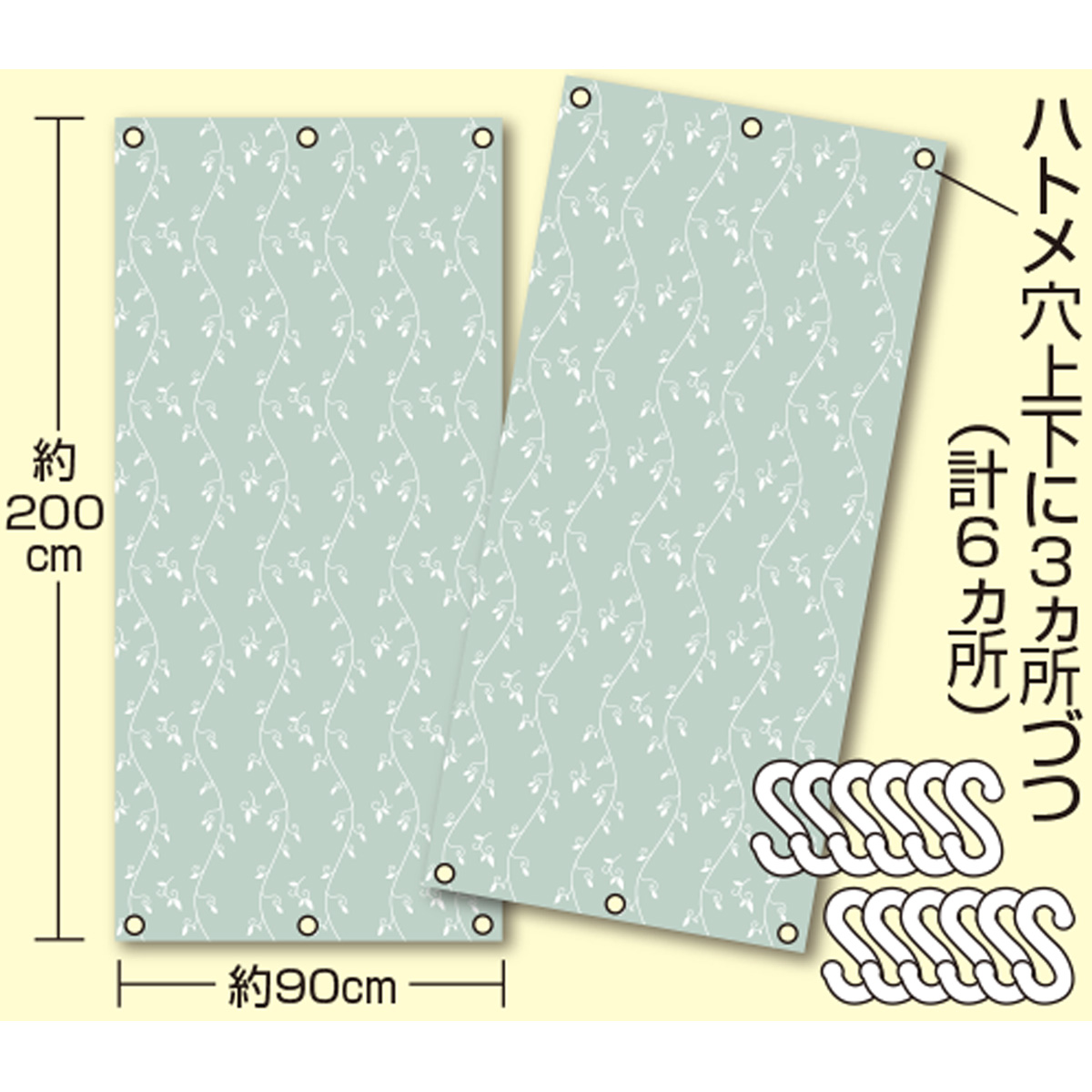 付属のS字フック(12個入り)でカーテンレールに簡単に取付できます。