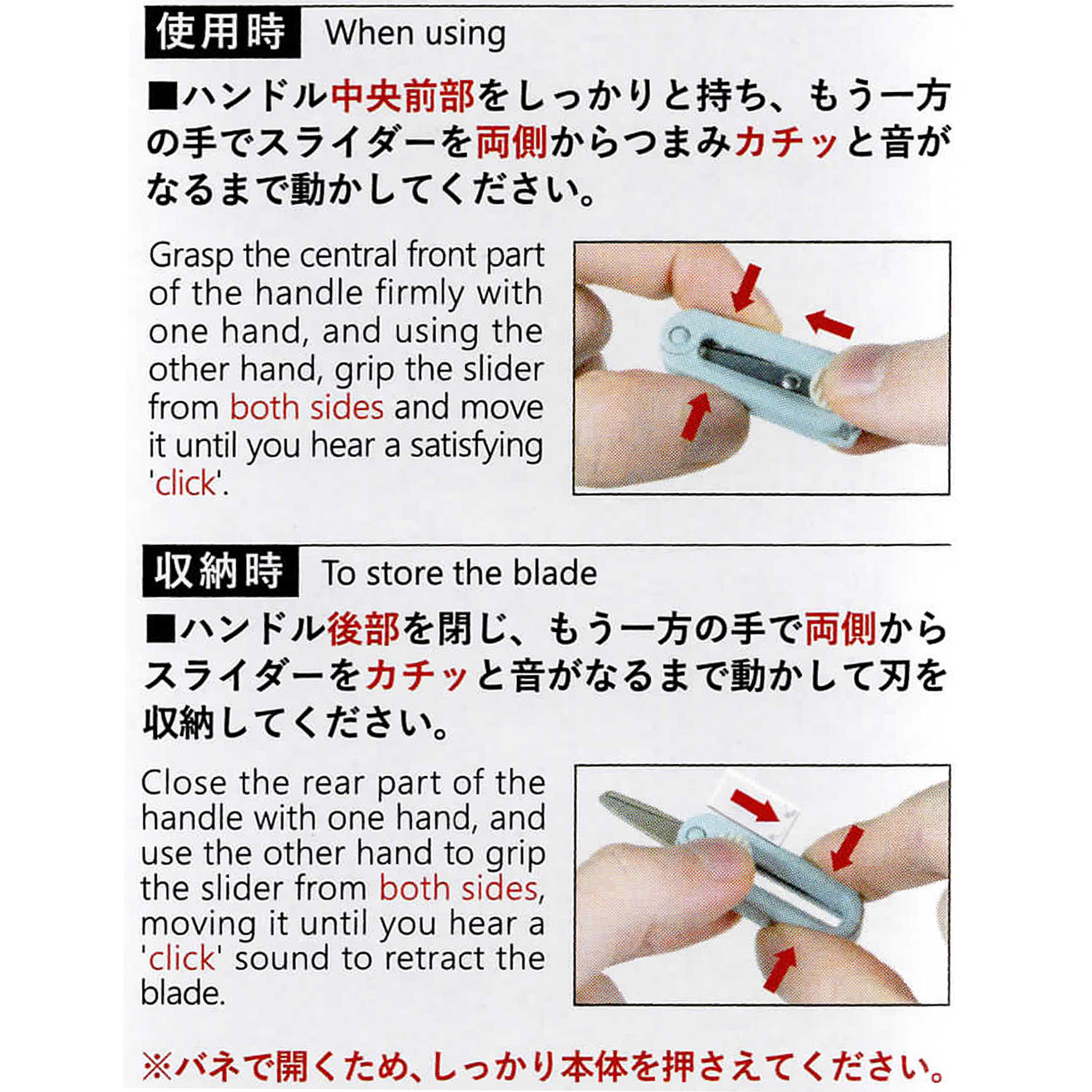 ハンドル後部を閉じ、もう一方の手で両側からスライダーをカチッと音が鳴るまで動かして刃を収納してください。