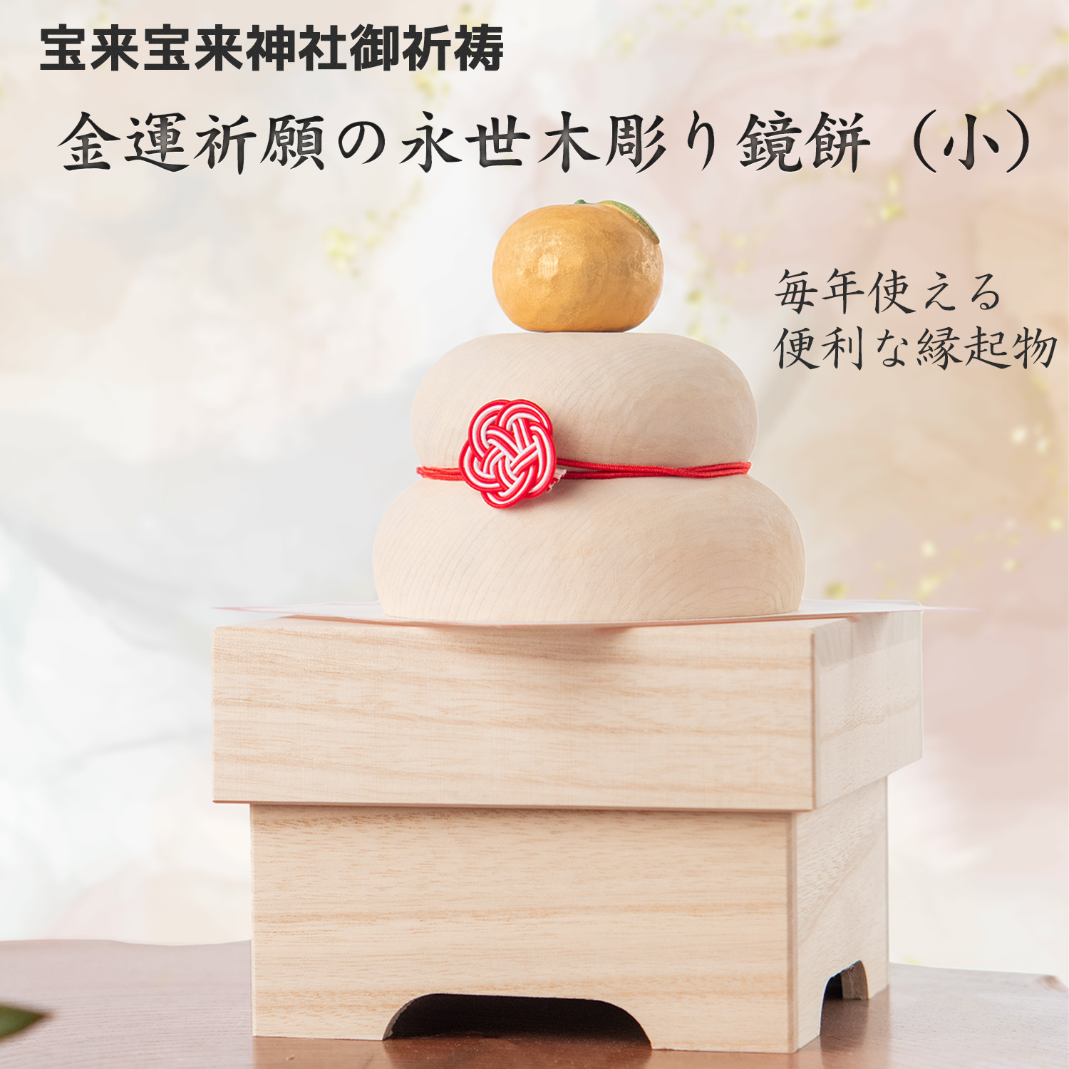 宝来宝来神社御祈祷『金運祈願の永世木彫り鏡餅』は、宝くじ当選に御利益ありとテレビやマスコミで度々紹介されている熊本の宝来宝来神社で金運招来のありがたい御祈祷を賜った、木彫りの鏡餅です。御祈祷を賜ることによって、鏡餅には年神さま、橙(だいだい)には当銭岩(宝来宝来神社の御神体)という二柱の神さまの依代となることが最大の特徴となります。