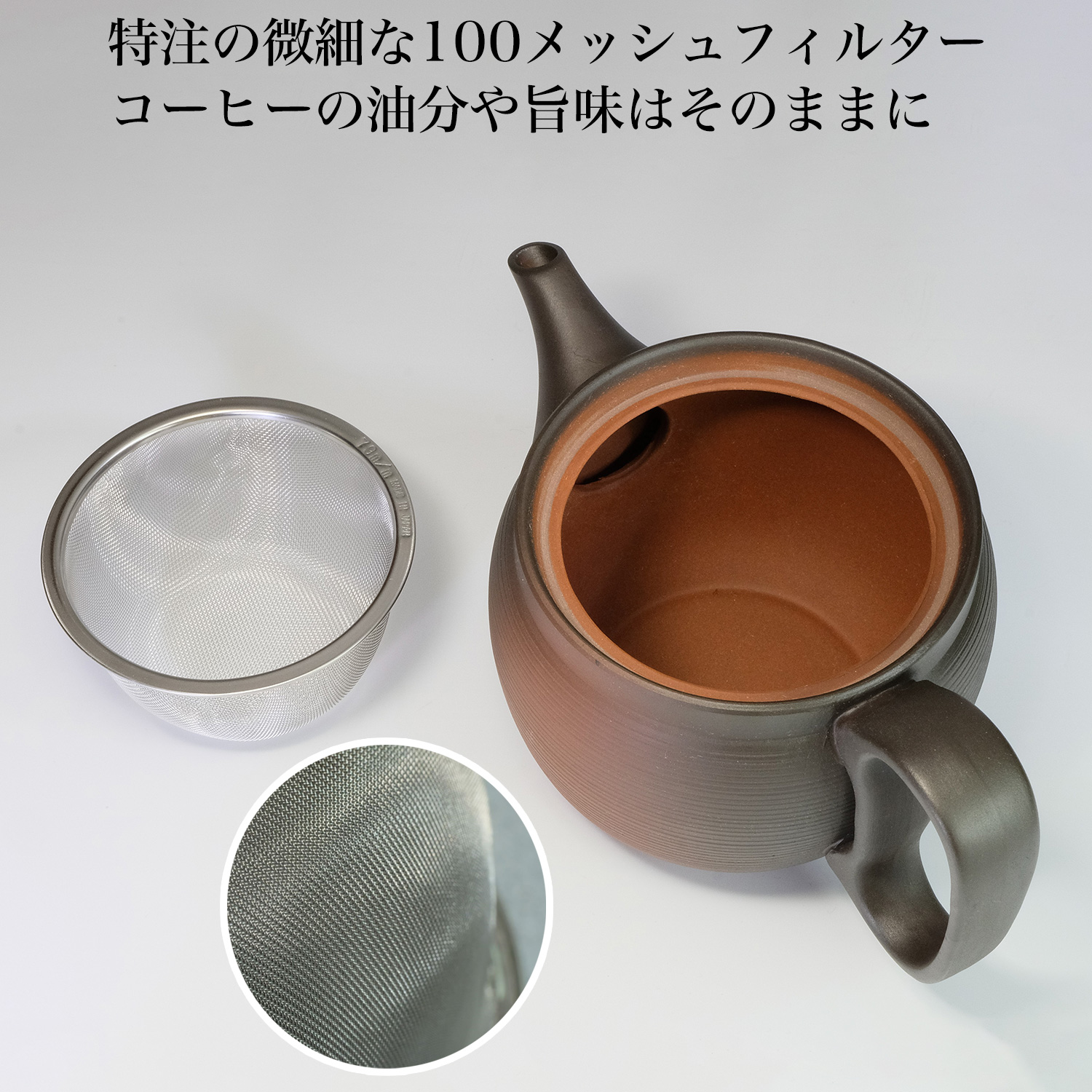 紙製のフィルターは微細な粉や雑味はカットするがコーヒーの旨味や油分なども吸収してしまいがちだ。この急須は100メッシュの微細なステンレスフィルターで漉すため旨味や風味がダイレクトに楽しめるように工夫。また、内側は無釉薬の素焼きは炭のように多孔質で、表面に無数の微細な穴が開いているため、まろやかなお茶を淹れるようにコーヒーの渋みや雑味を吸収してくれる効果も期待できる。常滑焼ならではの技術と工夫が詰まった急須なのだ。