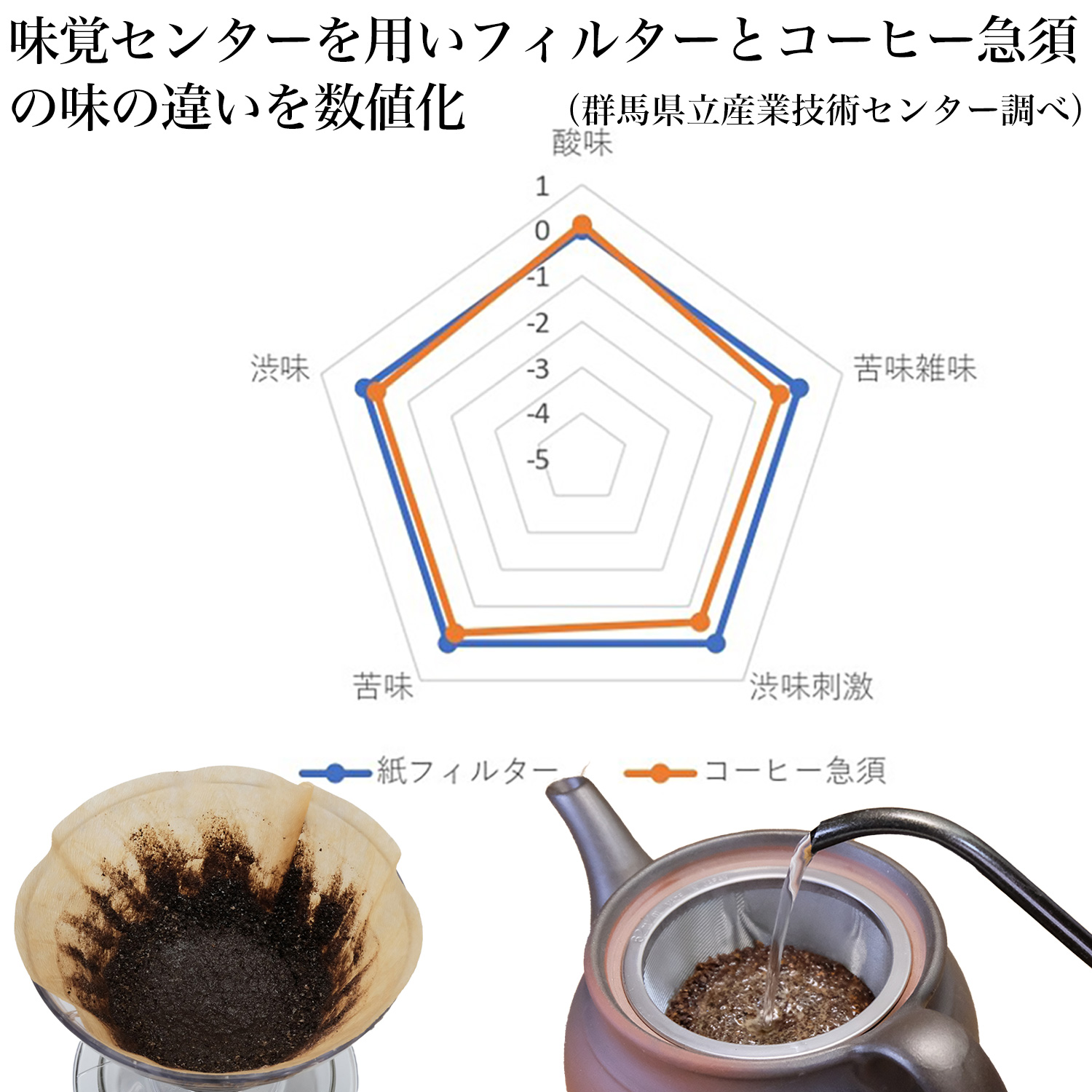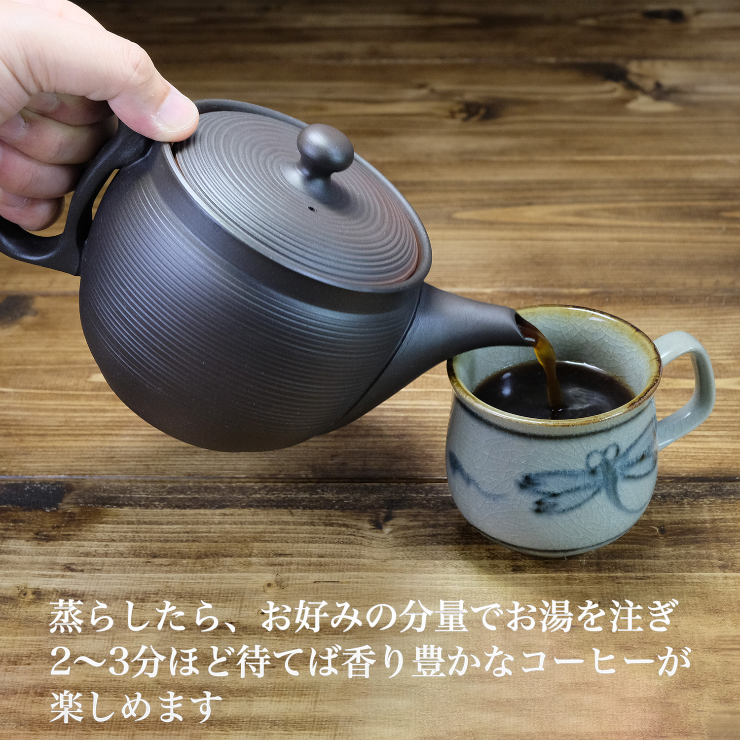 淹れ方は簡単。カゴ網フィルターに中〜粗挽きの粉を入れ、お湯を少し回しかけて1分ほど蒸らす。後は飲む分のお湯を入れたら2〜3分待ってからカップに注げば香り豊かで旨味のあるコーヒーが出来上がりだ。急須本体やフィルターの洗浄も簡単で、カゴ網フィルターは繰り返し使えるため紙フィルターのように買い置きする必要もなくエコで経済的。