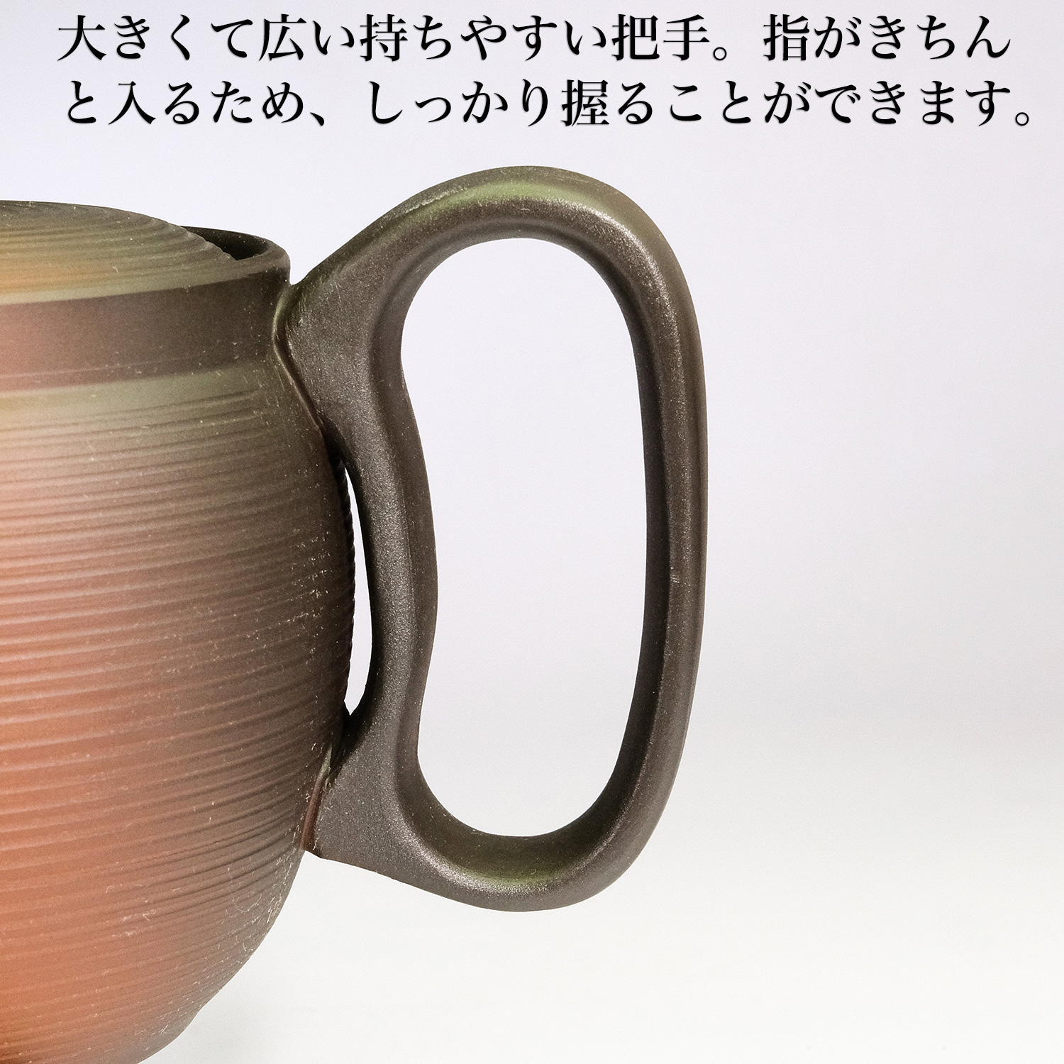 丸みを帯びた可愛らしいボディに指が入れやすい大き目の持ち手。しっかりと握ることができるので注ぎやすいデザインに仕上げている。おちょぼ口のような細めの注ぎ口はカップにコーヒーを入れやすく、入口の開口部も広めに取っているため、洗う際に楽に手が入れられる考えられた作りだ。表面は常滑焼特性の朱泥の雰囲気を残しつつ、薄く塗装を施した趣ある和の雰囲気が見事なグラデーションで彩られている。容量もマグカップ約1杯分とコンパクトで気軽に扱えるのが嬉しい。