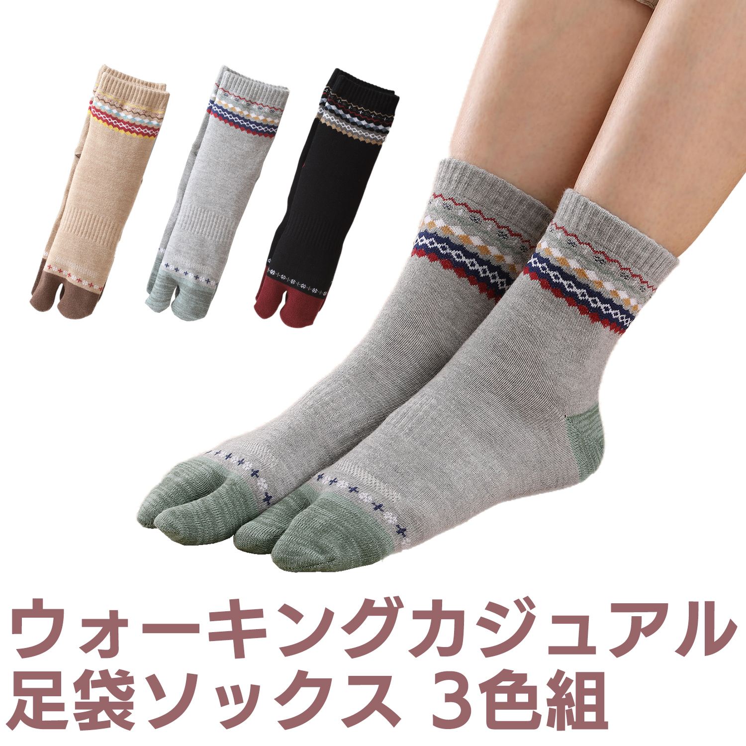 ウォーキング カジュアル 足袋ソックス 3色組 2221630 メッシュ編み サポート編み つま先補強 かかと補強 ムレない スポーツソックス 三笠 MIKASA
