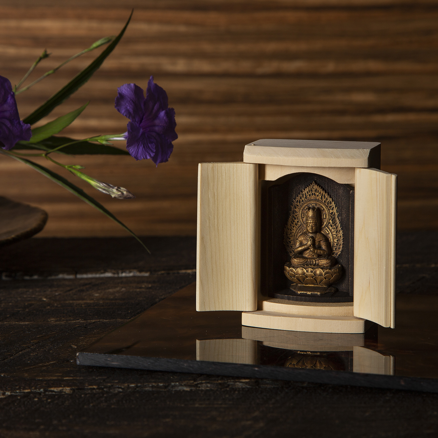 場所を選ばず携帯にも便利。小さな厨子に入った祈りの御仏「是空」シリーズのコンセプトは「身近な場所からそっと見守る祈りの御仏」です。