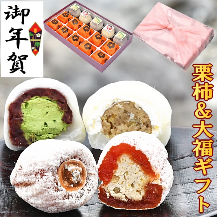 ■内容量:栗柿10個、抹茶クリーム大福3個、栗きんとんクリーム大福2個