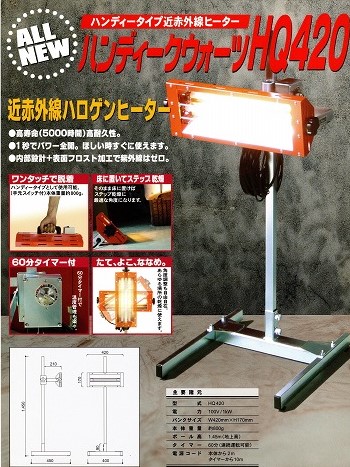 自動車塗装乾燥機 大都産業近赤外線ヒーター HQ420近赤外線の特徴は塗膜に集中吸収し効率の良い安定した乾燥作業が実現できます。強力な放射エネルギーを発生するので急速乾燥に有効です。※熱エネルギーが強いので、被塗物との距離を確認しての作業が必要です。メーカー直送となります。※本製品は予告なく仕様を変更することがあります。●部品不足(半導体等)による納期遅れ、欠品が発生する場合もございますので事前確認が必要です。★運送会社都合の為、配送先名は会社名での受付のみとなります。屋号でもOKです(個人名でのご注文はお受けできません)