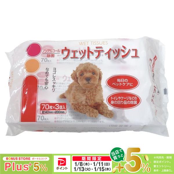 コーチョー 除菌 ペット用ウェットティッシュ 70枚×3個 ■ 犬用 猫用 ノンアルコール お手入れ用品