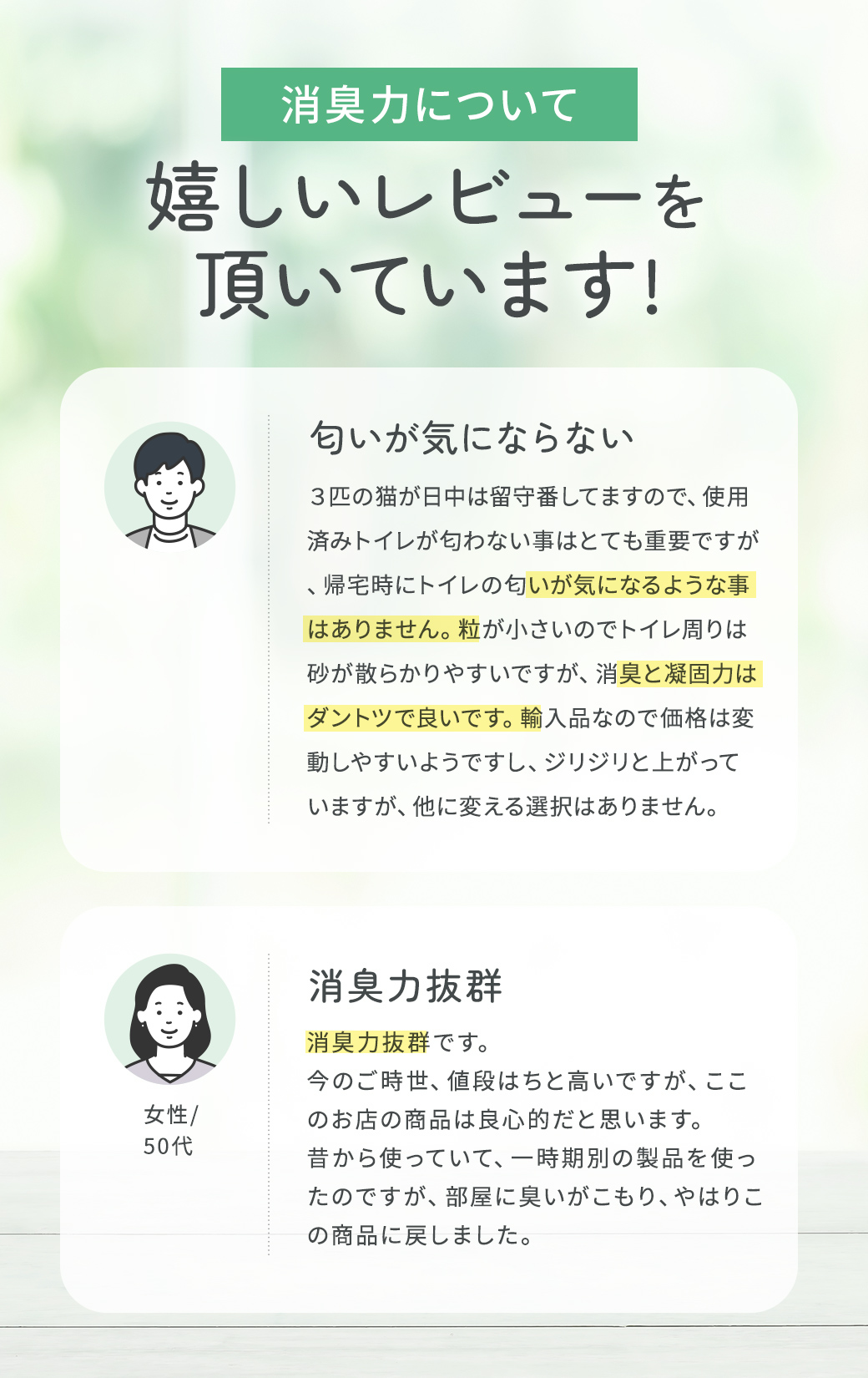 また、芳香タイプは使用後には石鹸のような爽やかな香りがお部屋に広がります。臭いが気になる猫ちゃんは、無香タイプがオススメです!