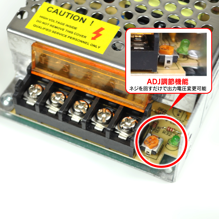 電源調整ボリューム付きで一定の電圧を出力できます。