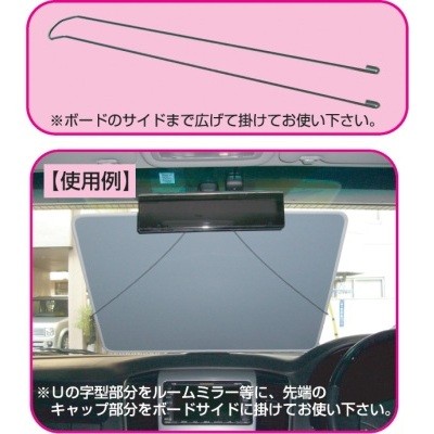 写真のように針金の中心をルームミラーにひっかけてボードの横に針金を広げて利用できます。