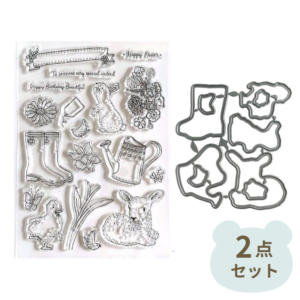 クリアスタンプ カッティングダイ 花 長靴 海外 ダイカット型 ペーパークラフト コラージュ素材 抜型 2点セット S03-1