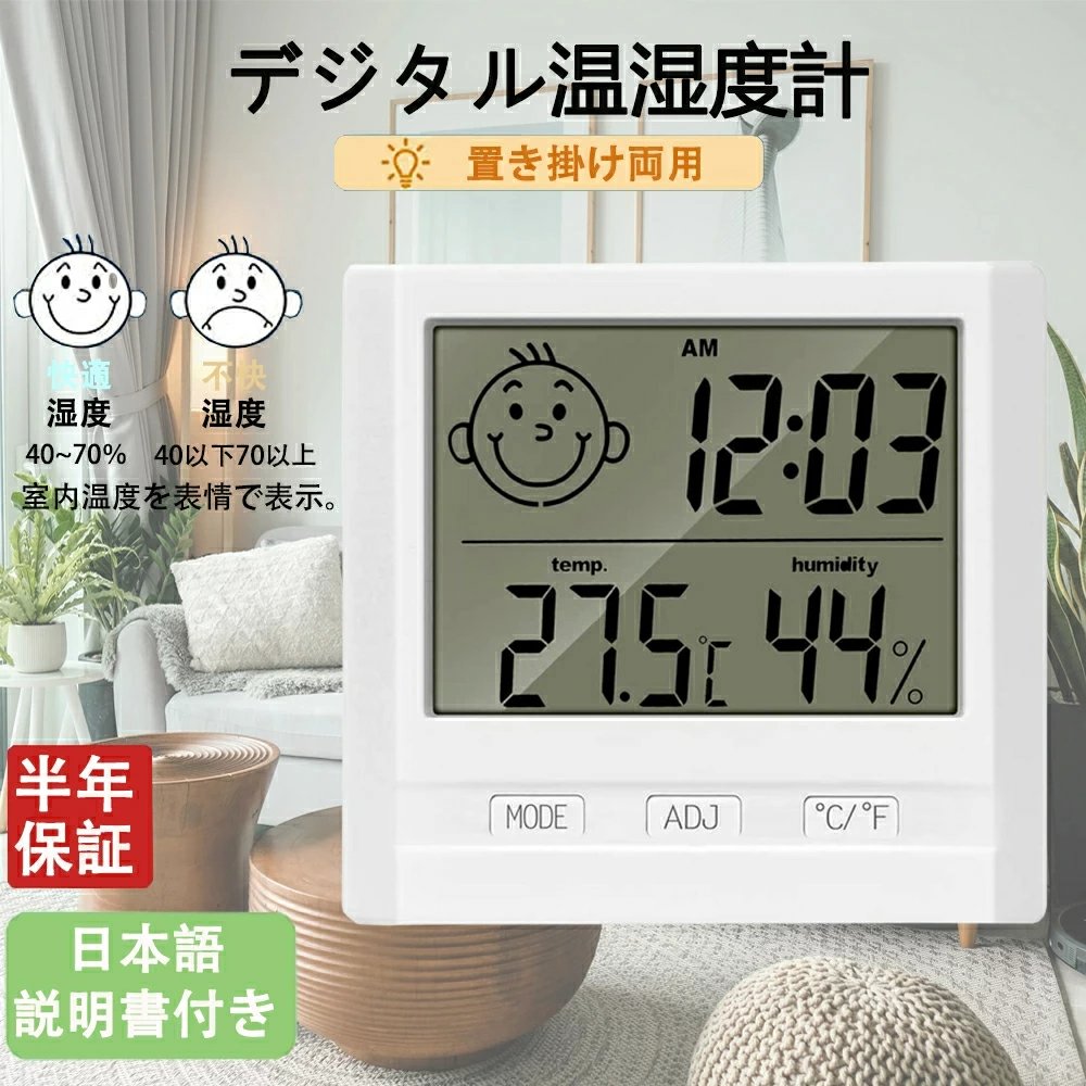 デジタル温度計 顔マーク 卓上湿度計 温湿度計 コンパクト 置き掛け両用タイプ 電池付き