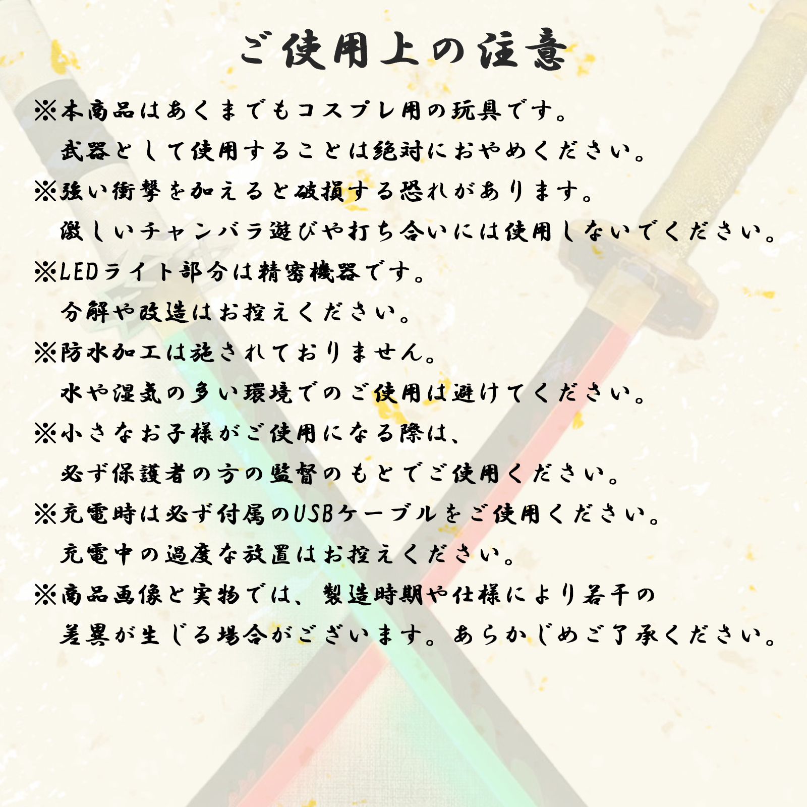 ・お子様がご使用の際、怪我をしたり他者に怪我を負わせることがないよう、保護者の方は目を離さないようご注意ください。