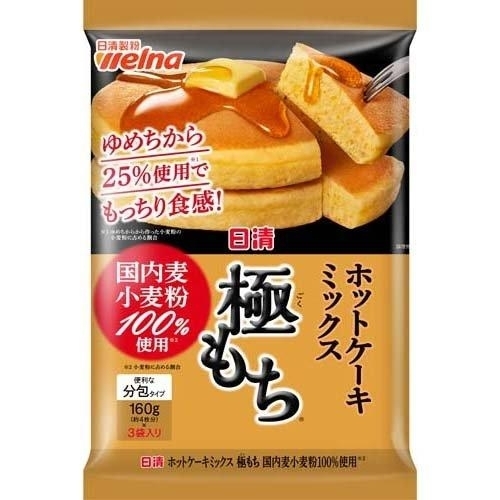 | 商品名 ホットケーキミックス 極もち 国内麦小麦粉100%使用 内容量 480g 商品説明 ●国内麦小麦粉と、「ゆめちから」から作った小麦粉を25%使用。 ●もっちり、しっとり食感。 ●便利な分包タイプ。 原材料 小麦粉(国内製造)、砂糖、でん粉、ぶどう糖、粉末植物油脂、食塩、卵白粉/加工でん粉、ベーキングパウダー、乳化剤、増粘多糖類、香料、着色料(クチナシ)、(一部に小麦・卵・乳成分・大豆を含む) 栄養成分 1袋(160g)当り エネルギー:586kcal、たんぱく質:13.4g、脂質:2.7g、炭水化物:127g、食塩相当量:1.8g でき上がり1枚分当り エネルギー:190kcal、たんぱく質:6.2g、脂質:3.4g、炭水化物:33.7g、食塩相当量:0.53g お問い合わせ先 株式会社日清製粉ウェルナ 東京都千代田区神田錦町1-25 0120-244-157 |