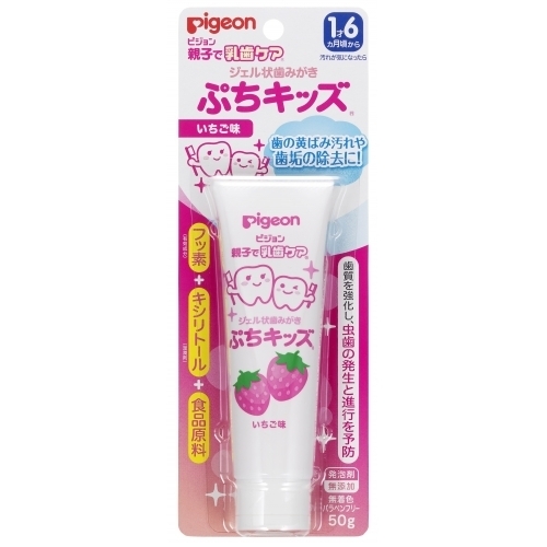 | 商品名 ジェル状ぷちキッズいちご味50g 50g 商品説明 1才6ヵ月頃からの乳歯の性質を考えてつくられた、歯の黄ばみ汚れや歯垢を除去し、歯質を強化し虫歯の発生及び進行を予防するジェル状歯みがきです。 歯の汚れが気になる離乳食卒業の頃から。 有効成分フッ素(フッ化ナトリウム)と食品で使われる成分でできています。 歯の再石灰化を促進し歯質を強化する薬用成分フッ素(フッ化ナトリウム)配合。 むし歯の原因となる酸をつくらないキシリトール配合(湿潤剤)。 お子様のデリケートな乳歯を傷つけにくい、ソフトな清掃剤(無水ケイ酸)使用。 落ちにくい黄ばみ汚れや歯垢を除去し生えたての歯の白さを守ります。 発泡剤無添加で泡立たず、汚れ落ちを確認しながら、すみずみまでていねいにみがけます。 ほんのり甘いいちご味。ミントタイプの香料不使用で、赤ちゃんが嫌がりません。 無着色・パラベンフリー・ノンミント。食品用原料成分使用。 [医薬部外品] 使用上の注意 ●傷・発疹等、異常のある部位にはお使いにならないでください。 ●使用中、発疹・かゆみなどの異常があらわれた場合は、使用を中止し、医師にご相談ください。 ●目に入ったときは、こすらずすぐに水で十分洗い流してください。 ●乳幼児の手の届かないところに保管してください。 ●お子様がご使用になる場合は、必ず保護者の方の監視のもとで使用させてください。 ●使用後は必ずキャップを閉めてください。 原材料/成分 有効成分:フッ化ナトリウム 湿潤剤:キシリトール、プロピレングリコール、グリセリン脂肪酸エステル、モノラウリン酸ポリグリセリル 粘結剤:カルボキシメチルセルロースナトリウム 清掃剤:無水ケイ酸 pH調整剤:クエン酸ナトリウム 販売、発売、製造、または輸入元 ピジョン株式会社 〒103-8480 東京都中央区日本橋久松町4番195号 お問合せ先 ピジョン株式会社 お客様相談室 0120ー741ー887 受付時間 9時~17時(土・日・祝日は除く) 原産国 日本 |