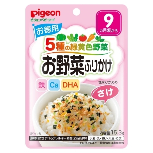 | 商品名 赤ちゃんのお野菜ふりかけ さけ(お徳用) 15.3g 商品説明 お徳用サイズのふりかけです。 使う量の調節ができて便利なジッパーつき袋タイプ。 緑黄色野菜を5種類配合。 カルシウム・鉄分・食物繊維・DHA入り。 カルシウムと鉄分は、1日の必要量の1/3摂取可能。 着色料・保存料・香料は使用していません。 使用上の注意 ●ごはんやおかゆに混ぜた際、野菜フレークが溶けて粘りがでる場合がありますが品質には問題ありません。 ●開封後はジッパーをしっかり閉めて保存しお早目にお召し上がりください。 ●ふりかけを取り、また、スプーンを袋の中に入れたままにしないでください。 ●食べ残しや作り置きは、与えないでください。 原材料/成分 でん粉、乳糖、ごま、鮭、昆布、野菜(モロヘイヤ、グリンピース、ほうれん草、トマト、かぼちゃ、にんじん)、かつお削り節、のり、水溶性食物繊維、食塩、砂糖、醸造酢、エキス(酵母、魚介、しいたけ、昆布)、乳清カルシウム、デキストリン、たんぱく加水分解物、DHA含有精製魚油、貝カルシウム、クエン酸第一鉄ナトリウム、酸化防止剤(ビタミンE) (原材料の一部に大豆、小麦を含む) ※原材料に含まれるアレルギー物質 乳、小麦、大豆、さけ、ごま(厚生労働省選定27品目) ※本品製造工場では卵、えび、かに、そば、落花生を含む製品を製造しています。 ※本品で使用しているのりは、えび、かにが混ざる方法で採取しています。 販売、発売、製造、または輸入元 ピジョン株式会社 〒103-8480 東京都中央区日本橋久松町4番7号 お問合せ先 ピジョン株式会社 お客様相談室 0120ー741ー887 受付時間 9時~17時(土・日・祝日は除く) 原産国 日本 |