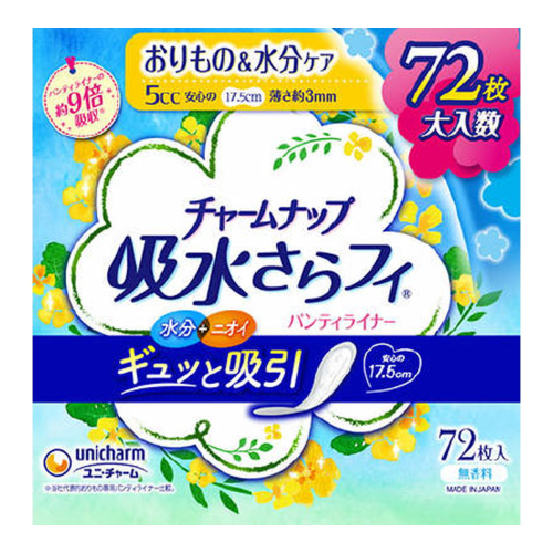 | 名称 チャームナップ吸水さらフィ微量用 内容量 72枚(長さ:17.5cm) 商品説明 パンティライナーサイズで水分・ニオイまでギュッと吸引!薄いのにしっかり吸収。 高吸収シート搭載でお肌サラサラ!水分を瞬間吸収して閉じ込めます。 通気性シート採用でムレずにサラっと快適です。 消臭するポリマー配合、気になるニオイも閉じ込めます。 保管および取扱い上の注意 ●開封後はほこりや虫などの異物が入らないよう、衛生的に保管してください。 ◆本品記載の使用法・使用上の注意をよくお読みの上ご使用下さい。 発売元、製造元、輸入元又は販売元、消費者相談窓口 ユニ・チャーム |