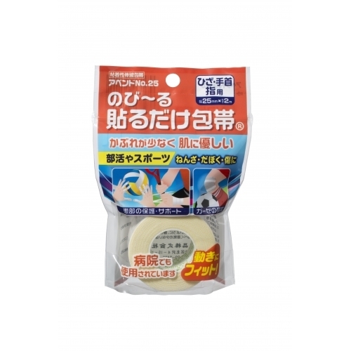 | 名称 アベンドNo.25 貼るだけ包帯 内容量 2.5cm×2m 商品説明 「アベンドNo.25 貼るだけ包帯 2.5cm×2m」は、ソフトな布製で、貼付け部分に負担がかからない伸縮包帯です。しっかりとした粘着力で、汗ばむ箇所や関節部・指先など、はがれやす い所によくつきます。適度な透湿性があり、かぶれの少ないソフトな布タイプ。手で簡単に切れるので、手近にハサミがないときでも便利です。 ガーゼパッドやシップ剤の固定、靴ずれの防止などに。 使用上の注意 1.今までに薬や化粧品等によるアレルギー症状(例えば発疹・発赤、かゆみ、かぶれ等)を起こしたことがある人は、使用前に医師又は薬剤師に相 談してください。 2.粘着面を患部にはらないでください。 3.使用中または使用後に、発疹・発赤、かゆみ、かぶれ等の症状があらわれた場合は、使用を中止してください。 4.剥がすときは痛みの無いように、静かにおとりください。 5.直射日光をさけ、なるべく湿気の少ない涼しい所に保管してください。 |