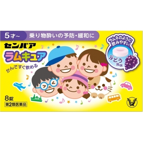 医薬品の使用期限 医薬品に関しては特別な表記の無い限り、1年以上の使用期限のものを販売しております。1年以内のものに関しては使用期限を記載します。 商品名 【第2類医薬品】センパアラムキュア 8錠 内容量 8錠 商品説明 ●センパア ラムキュアは、ラムネのようにかんで飲めるチュアブルタイプの乗り物酔い薬です。 ●水なしで飲めるので外出先でも便利です。 ●5才から服用可能、お子さまに人気のぶどう風味です。 用法・容量・使用方法 次の量を1 日 2 回 まで、かむか口中で溶かして服用してください。乗物酔いの予防には乗車船の 30 分前に服用してください。 なお、必要に応じて追加服用する場合には、1 回量を 4 時間以上の間隔をおき服用してください。 11才以上 1 回 2 錠 5才〜10 才 1 回 1 錠 5才 未満 服用しないこと 効能・効果 乗物酔いによるめまい・吐き気・頭痛の予防及び緩和 使用上の注意 してはいけないこと (守らないと現在の症状が悪化したり、副作用・事故が起こりやすくなります) 本剤を服用している間は、次のいずれの医薬品も使用しないでください 他の乗物酔い薬、かぜ薬、解熱鎮痛薬、鎮静薬、鎮咳去痰薬、胃腸鎮痛鎮痙薬、抗ヒスタミン剤を含有する内服薬等(鼻炎用内服薬、アレルギー用薬等) 服用後、乗物又は機械類の運転操作をしないでください (眠気や目のかすみ、異常なまぶしさ等の症状があらわれることがあります) 相談すること 次の人は服用前に医師、薬剤師又は登録販売者に 相談してください (1)医師の治療を受けている人。 (2)妊婦又は妊娠していると思われる人。 (3)高齢者。 (4)薬などによりアレルギー症状を起こしたことがある人。 (5)次の症状のある人。 排尿困難 (6)次の診断を受けた人。 緑内障、心臓病 服用後、次の症状があらわれた場合は副作用の可能性があるので、直ちに服用を中止し、この説明書を持って医師、薬剤師又は登録販売者に相談してください 関係部位:皮膚 症状:発疹・発赤、かゆみ 関係部位:精神神経系 症状:頭痛 関係部位:泌尿器 症状:排尿困難 関係部位:その他 症状:顔のほてり、異常なまぶしさ まれに下記の重篤な症状が起こることがあります。 その場合は直ちに医師の診療を受けてください。 症状の名称:再生不良性貧血 症状:青あざ、鼻血、歯ぐきの出血、発熱、皮膚や粘膜が青白くみえる、疲労感、動悸、息切れ、気分が悪くなりくらっとする、血尿等があらわれる。 症状の名称:無顆粒球症 症状:突然の高熱、さむけ、のどの痛み等があらわれる。 服用後、次の症状があらわれることがあるので、このような症状の持続又は増強が見られた場合には、服用を中止し、この説明書を持って医師、薬剤師又は登録販売者に相談してください口のかわき、便秘、眠気、目のかすみ 保管上の注意 (1)直射日光の当たらない湿気の少ない涼しい所に保管してください。 (2)小児の手の届かない所に保管してください。 (3)他の容器に入れ替えないでください。(誤用の原因になったり品質が変わることがあります) (4)使用期限を過ぎた製品は服用しないでください。なお、使用期限内であっても、開封後は6 ヵ月以内に服用してください。(品質保持のため) 成分・原材料 成分 2錠中 d-クロルフェニラミンマレイン酸塩 1.32mg スコポラミン臭化水素酸塩水和物 0.16mg 販売、発売、製造、または輸入元 大正製薬株式会社 〒170-8633 東京都豊島区高田3丁目24番1号 お問合せ先 連絡先 大正製薬株式会社 お客様119番室 受付時間 8:30〜21:00(土、日、祝日を除く) 電話 03−3985−1800 原産国 日本 |