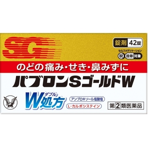 | 医薬品の使用期限 医薬品に関しては特別な表記の無い限り、1年以上の使用期限のものを販売しております。1年以内のものに関しては使用期限を記載します。 商品名 【第(2)類医薬品】 パブロンSゴールドW錠 【セルフメディケーション税制対象】 内容量 42錠 商品説明 パブロンSゴールドW錠は、気道粘膜クリア成分のアンブロキソール塩酸塩と気道粘膜リペア成分のL-カルボシステインで、気道粘膜バリアをWケアするクリア&リペアのW処方。のどの痛み、せき、鼻みずなどかぜの諸症状を和らげます。大人1回2錠※。のみやすい錠剤です(※12〜14才は1回1錠)。 用法・容量・使用方法 次の量を1 日 3 回食後なるべく 30 分以内に 水又はぬるま湯で 服用してください。 15才以上 1 回 2 錠、 12 才〜 14 才 1 回 1 錠 、12才未満 服用しないこと 効能・効果 かぜの諸症状(のどの痛み、 せき、鼻みず、鼻づまり、 くしゃみ、たん、 頭痛、 発熱、悪寒、関節の痛み、筋肉の痛み)の緩和 使用上の注意 1.次の人は服用しないでください(1 )本剤又は 本剤の成分により アレルギー症状を起こしたことがある人。 (2 )本剤又は他のかぜ薬、解熱鎮痛薬を服用してぜんそくを起こしたことがある人。(3) 12 才未満の小児。 2.本剤を服用している間は、次のいずれの医薬品も使用しないでください 他のかぜ薬、解熱鎮痛薬、鎮静薬、鎮咳去痰薬、抗ヒスタミン剤を含有する内服薬等(鼻炎用内服薬、乗物酔い薬、アレルギー用薬等) 3.服用後、乗物又は機械類の運転操作をしないでください(眠気等 があらわれることがあります) 4.授乳中の人は本剤を服用しないか、本剤を服用する場合は授乳を避けてください 5.服用 前後 は飲酒しないでください 6.長期連用しないでください 7.次 に該当する人は医師又は薬剤師にお申し出ください・医師又は歯科医師の治療を受けている人。 ・妊婦又は妊娠していると思われる人。・薬などによりアレルギー症状を起こしたことがある人。 ・次の症状のある人。高熱、排尿困難・次の診断を受けた人。心臓病、肝臓病、腎臓病、胃・十二 指腸潰瘍、緑内障 、呼吸機能障害、閉塞性睡眠時無呼吸症候群、肥満症 【小児に服用させる場合には、保護者の指導監督のもとに服用させてください。 】 保管上の注意 (1)直射日光の当たらない湿気の少ない涼しい所に密栓して保管してください。 (2)小児の手の届かない所に保管してください。 (3)他の容器に入れ替えないでください。(誤用の原因になったり品質が変わることがあります) (4)使用期限を過ぎた製品は服用しないでください。なお、使用期限内であっても、開封後は 6 ヵ月以内に服用してください。(品質保持のため) 成分・原材料 2錠中 アンブロキソール塩酸塩15mg L カルボシステイン 250mg ジヒドロコデインリン酸塩8mg アセトアミノフェン 300mg クロルフェニラミンマレイン酸塩2.5mg リボフラビン( ビタミン B 2 4mg 販売、発売、製造、または輸入元 大正製薬株式会社 〒170-8633 東京都豊島区高田3丁目24番1号 お問合せ先 連絡先 大正製薬株式会社 お客様119番室 受付時間 8:30〜21:00(土、日、祝日を除く) 電話 03−3985−1800 原産国 日本 |