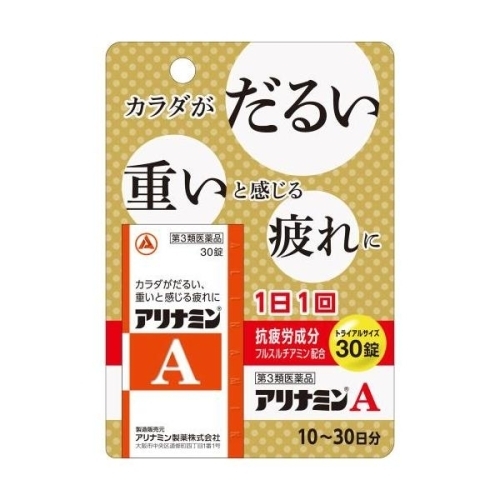 | 医薬品の使用期限 医薬品に関しては特別な表記の無い限り、1年以上の使用期限のものを販売しております。1年以内のものに関しては使用期限を記載します。 商品名 【第3類医薬品】 アリナミンA 内容量 30錠 商品説明 ●吸収にすぐれたビタミンB1誘導体フルスルチアミンを配合し、毎日の生活の中で感じる、カラダが「だるい」「重い」といった疲れにすぐれた効果をあらわします。 ●補酵素(コエンザイムA)となってエネルギーの産生に重要な働きをするパントテン酸カルシウムとフルスルチアミン、ビタミンB2、ビタミンB6を配合し、三大栄養素(脂質、タンパク質、糖質)を効率よくエネルギーに変える助けをするので、疲れたカラダにすぐれた効果をあらわします。 ●服用しやすい黄色の糖衣錠です。 効能 1.次の場合のビタミンB1の補給 肉体疲労時、妊娠・授乳期、病中病後の体力低下時 2.次の諸症状の緩和 筋肉痛・関節痛(腰痛、肩こり、五十肩など)、神経痛、手足のしびれ、便秘、眼精疲労 3.脚気 「ただし、上記2および3の症状について、1ヵ月ほど使用しても改善がみられない場合は、医師または薬剤師に相談すること。」 用法・用量 次の量を、食後すぐに水またはお湯で、かまずに服用すること。 年齢・・・1回量・・・1日服用回数 15歳以上・・・1〜3錠・・・1回 11歳〜14歳・・・1〜2錠・・・1回 7歳〜10歳・・・1錠・・・1回 7歳未満・・・服用しないこと 成分 3錠(15歳以上の1日最大服用量)中 フルスルチアミン(ビタミンB1誘導体)として・・・100mg (フルスルチアミン塩酸塩・・・109.16mg) ピリドキシン塩酸塩(ビタミンB6)・・・20mg シアノコバラミン(ビタミンB12)・・・60μg リボフラビン(ビタミンB2)・・・12mg パントテン酸カルシウム・・・15mg 添加物:乳酸カルシウム水和物、部分アルファー化デンプン、ヒプロメロース、セルロース、乳糖水和物、ヒドロキシプロピルセルロース、ステアリン酸Mg、トウモロコシデンプン、エリスリトール、酸化チタン、アラビアゴム、炭酸Ca、タルク、白糖 使用上の注意 相談すること 1.服用後、次の症状があらわれた場合は副作用の可能性があるので、直ちに服用を中止し、この文書を持って医師、薬剤師または登録販売者に相談すること 関係部位:症状 皮膚:発疹・発赤、かゆみ 消化器:吐き気・嘔吐、口内炎 2.服用後、次の症状があらわれることがあるので、このような症状の持続または増強が見られた場合には、服用を中止し、この文書を持って医師、薬剤師または登録販売者に相談すること 軟便、下痢 3.1ヵ月位服用しても症状がよくならない場合は服用を中止し、この文書を持って医師、薬剤師または登録販売者に相談すること お問い合わせ先 アリナミン製薬株式会社 東京都千代田区丸の内1丁目8番2号 鉄鋼ビルディング23階 お客様相談室:0120−567−087 受付時間:9:00〜17:00(土・日・祝日を除く) |