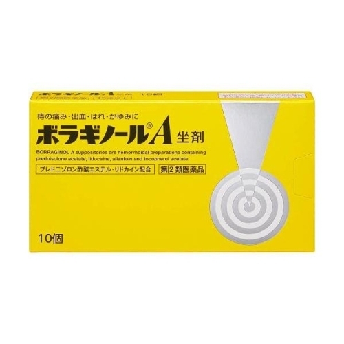 | 医薬品の使用期限 医薬品に関しては特別な表記の無い限り、1年以上の使用期限のものを販売しております。1年以内のものに関しては使用期限を記載します。 商品名 【第(2)類医薬品】 ボラギノールA坐剤 内容量 10個入 商品説明 1.4種の成分がはたらいて、痔による痛み・出血・はれ・かゆみにすぐれた効果を発揮します。 ●プレドニゾロン酢酸エステルが出血、はれ、かゆみをおさえ、リドカインが痛み、かゆみをしずめます。 ●アラントインが傷の治りをたすけ組織を修復するとともに、ビタミンE酢酸エステルが血液循環を改善し、痔の症状の緩和をたすけます。 2.効果の発現をよくするため、体温ですみやかに溶ける油脂性基剤を用いて患部に直接作用するよう製剤設計しています。 ●刺激が少なく挿入しやすい油脂性基剤が傷ついた患部を保護し、スムーズな排便をたすけます。 ●アルミシートに入った白色〜わずかに黄みをおびた白色の坐剤です。 効能 いぼ痔、きれ痔(さけ痔)の痛み、出血、はれ、かゆみの緩和 用法・用量 被包を除き、次の量を肛門内に挿入すること。 年齢:1回量:1日使用回数 成人(15歳以上):1個:1〜2回 15才未満:使用しないこと 成分 1個(1.75g)中 はたらき:成分:含量 炎症をおさえ、出血、はれ、かゆみをしずめます。:プレドニゾロン酢酸エステル:1mg 局所の痛み、かゆみをしずめます。:リドカイン:60mg 傷の治りをたすけ、組織を修復します。:アラントイン:20mg 末梢の血液循環をよくし、うっ血の改善をたすけます。:ビタミンE酢酸エステル(トコフェロール酢酸エステル):50mg 添加物:ハードファット 使用上の注意 してはいけないこと (守らないと現在の症状が悪化したり、副作用が起こりやすくなる) 1.次の人は使用しないこと (1)本剤または本剤の成分によりアレルギー症状を起こしたことがある人。 (2)患部が化膿している人。 2.長期連用しないこと 相談すること 1.次の人は使用前に医師、薬剤師または登録販売者に相談すること (1)医師の治療を受けている人。 (2)妊婦または妊娠していると思われる人。 (3)薬などによりアレルギー症状を起こしたことがある人。 2.使用後、次の症状があらわれた場合は副作用の可能性があるので、直ちに使用を中止し、添付文書を持って医師、薬剤師または登録販売者に相談すること 関係部位:症状 皮膚:発疹・発赤、かゆみ、はれ その他:刺激感、化膿 まれに下記の重篤な症状が起こることがある。その場合は直ちに医師の診療を受けること。 症状の名称:症状 ショック(アナフィラキシー):使用後すぐに、皮膚のかゆみ、じんましん、声のかすれ、くしゃみ、のどのかゆみ、息苦しさ、動悸、意識の混濁等があらわれる。 3.10日間位使用しても症状がよくならない場合は使用を中止し、添付文書を持って医師、薬剤師または登録販売者に相談すること お問い合わせ先 天藤製薬株式会社 大阪府豊中市新千里東町一丁目5番3号 お客様相談室:0120−932−904 受付時間:9:00〜17:00(土、日、休、祝日を除く) |