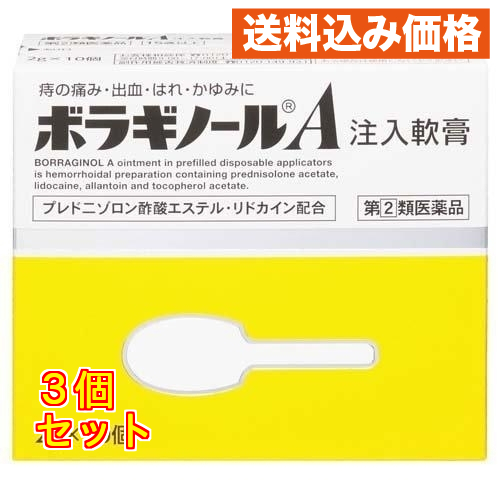 | 医薬品の使用期限 医薬品に関しては特別な表記の無い限り、1年以上の使用期限のものを販売しております。1年以内のものに関しては使用期限を記載します。 商品名 【第(2)類医薬品】 ボラギノールA注入軟膏 内容量 2g×10個入 商品説明 1.4種の成分がはたらいて、痔による痛み・出血・はれ・かゆみにすぐれた効果を発揮します。 ●プレドニゾロン酢酸エステルが出血、はれ、かゆみをおさえ、リドカインが痛み、かゆみをしずめます。 ●アラントインが傷の治りをたすけ組織を修復するとともに、ビタミンE酢酸エステルが血液循環を改善し、痔の症状の緩和をたすけます。 2.肛門内部・外部の痔に使用できる携帯に便利な痔疾用薬です。 ●患部や薬剤に直接手を触れず衛生的に注入できます。 3.刺激が少なく、なめらかですべりのよい油脂性基剤が傷ついた患部を保護します。 ●患部を傷つけないように、容器先端(ノズル)を丸くしています。 ●白色〜わずかに黄みをおびた白色の軟膏です。 効能 いぼ痔・きれ痔(さけ痔)の痛み・出血・はれ・かゆみの緩和 用法・用量 ・ノズル部分を肛門内に挿入し、全量をゆっくり注入すること。(肛門内に注入する場合) 年齢:1回量:1日使用回数 成人(15歳以上):1個:1〜2回 15歳未満:使用しないこと または ・次の量を患部に塗布すること。なお、一度塗布に使用したものは、注入には使用しないこと。(患部に塗布する場合) 年齢:1回量:1日使用回数 成人(15歳以上):適量:1〜3回 15歳未満:使用しないこと 成分 1個(2g)中 はたらき:成分:含量 炎症をおさえ、出血、はれ、かゆみをしずめます。:プレドニゾロン酢酸エステル:1mg 局所の痛み、かゆみをしずめます。:リドカイン:60mg 傷の治りをたすけ、組織を修復します。:アラントイン:20mg 末梢の血液循環をよくし、うっ血の改善をたすけます。:ビタミンE酢酸エステル(トコフェロール酢酸エステル):50mg 添加物:白色ワセリン、中鎖脂肪酸トリグリセリド、モノステアリン酸グリセリン ・注入式のため、容器の中に薬剤が少量残りますが、残量を見込んで充填しています。 使用上の注意 してはいけないこと (守らないと現在の症状が悪化したり、副作用が起こりやすくなる) 1.次の人は使用しないこと (1)本剤または本剤の成分によりアレルギー症状を起こしたことがある人。 (2)患部が化膿している人。 2.長期連用しないこと 相談すること 1.次の人は使用前に医師、薬剤師または登録販売者に相談すること (1)医師の治療を受けている人。 (2)妊婦または妊娠していると思われる人。 (3)薬などによりアレルギー症状を起こしたことがある人。 2.使用後、次の症状があらわれた場合は副作用の可能性があるので、直ちに使用を中止し、添付文書を持って医師、薬剤師または登録販売者に相談すること 関係部位:症状 皮膚:発疹・発赤、かゆみ、はれ その他:刺激感、化膿 まれに下記の重篤な症状が起こることがある。その場合は直ちに医師の診療を受けること。 症状の名称:症状 ショック(アナフィラキシー):使用後すぐに、皮膚のかゆみ、じんましん、声のかすれ、くしゃみ、のどのかゆみ、息苦しさ、動悸、意識の混濁等があらわれる。 3.10日間位使用しても症状がよくならない場合は使用を中止し、添付文書を持って医師、薬剤師または登録販売者に相談すること お問い合わせ先 天藤製薬株式会社 大阪府豊中市新千里東町一丁目5番3号 お客様相談係:0120−932−904 受付時間:9:00〜17:00(土、日、休、祝日を除く) |