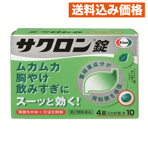 | 医薬品の使用期限 医薬品に関しては特別な表記の無い限り、1年以上の使用期限のものを販売しております。1年以内のものに関しては使用期限を記載します。 商品名 【第2類医薬品】 サクロン錠 40錠 内容量 40錠 用法・容量/使用方法 次の量を食間および就寝前の空腹時に水またはお湯で服用してください。<年齢 1回量 服用回数>成人(15歳以上)4錠 1日3回 8歳以上15歳未満2錠 1日3回 8歳未満服用しないこと -※食間とは、食後2時間ほど経過し、胃の中に食べた物がほぼなくなっている時です。<用法・用量に関連する注意>小児(8歳以上15歳未満)に服用させる場合には、保護者の指導監督のもとに服用させてください。 効能・効果 胸やけ、飲みすぎ、胃痛、胃酸過多、胃もたれ、胃部不快感、胃部膨満感、胃重、 胸つかえ、げっぷ、はきけ(むかつき、胃のむかつき、二日酔・悪酔のむかつき、嘔気、悪心)、嘔吐 使用上の注意 してはいけないこと・・(1)本剤を服用している間は、次の医薬品を服用しないでください。 胃腸鎮痛鎮痙薬 (2)授乳中の人は本剤を服用しないか、本剤を服用する場合は授乳を避けてください。(母乳に移行して乳児の脈が速くなることがあります。)相談すること・・(1)次の人は服用前に医師、薬剤師又は登録販売者に相談してください。 ?医師の治療を受けている人 ?妊婦又は妊娠していると思われる人 ?高齢者 ?薬などによりアレルギー症状を起こしたことがある人 ?次の症状がある人 排尿困難 ?次の診断を受けた人 腎臓病、心臓病、緑内障、甲状腺機能障害 (2)服用後、次の症状があらわれた場合は副作用の可能性があるので、直ちに服用を中止し、この説明書を持って医師、薬剤師又は登録販売者に相談してください。皮膚・・発疹・発赤、かゆみ (3)服用後、次の症状があらわれることがあるので、このような症状の持続又は増強が見られた場合には、服用を中止し、この説明書を持って医師、薬剤師又は登録販売者に相談してください。 口のかわき、便秘、下痢 (4)2週間位服用しても症状がよくならない場合は服用を中止し、この説明書を持って医師、薬剤師又は登録販売者に相談してください。 その他の注意 母乳が出にくくなることがあります。 保管上の注意 1.直射日光の当たらない湿気の少ない涼しい所に保管してください。2.小児の手の届かない所に保管してください。3.他の容器に入れ替えないでください。また、本容器内に他の薬剤等を入れないでください。(誤用の原因になったり品質が変わります。)4.4錠入り分包は、次のことに注意してください。・分包を分割した残りを服用する時は、袋の口を折り返して保管し、2日をすぎた場合には服用しないでください。5.96錠包装は、次のことに注意してください。・容器内の詰め物は、輸送中の錠剤破損防止用です。容器のキャップを開けた後は捨ててください。また容器は密栓して保管してください。・使用期限内であっても一度容器のキャップを開けた後は、品質保持の点から6ヵ月以内を目安に使用してください。箱の内ブタの「開封年月日」欄に、開封日を記入してください。6.使用期限をすぎた製品は使用しないでください。 原材料/成分 成人1日量12錠中に次の成分を含みます。銅クロロフィリンカリウム120mg 無水リン酸水素カルシウム1,020mg 沈降炭酸カルシウム1,020mg 水酸化マグネシウム960mg ロートエキス30mg <添加物>トウモロコシデンプン、ヒドロキシプロピルセルロース、l-メントール、香料、塩化K、ケイヒ、ステアリン酸Mg、ポビドン・成分に関する注意服用後、便が緑色になる場合がありますが、銅クロロフィリンカリウム(緑色)が排泄されるための着色であり、心配はありません。サクロン錠には、アルミニウムを含む成分は使用していません。 販売、発売、製造、または輸入元 エーザイ株式会社 東京都文京区小石川4−6−10 お問合せ先 エーザイ「hhcホットライン」フリーダイヤル0120−161−454 受付時間/平日9:00〜18:00(土・日・祝日9:00〜17:00) 原産国 日本 |
