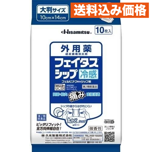 | 医薬品の使用期限 医薬品に関しては特別な表記の無い限り、1年以上の使用期限のものを販売しております。1年以内のものに関しては使用期限を記載します。 商品名 【第2類医薬品】 フェイタス シップ 冷感 【セルフメディケーション税制対象】 内容量 10枚入 商品説明 ●優れた抗炎症・鎮痛効果のある「フェルビナク」を1枚あたり70mg配合した鎮痛消炎シップ剤です。 ●「フェルビナク」は痛みに関係する物質(プロスタグランジン)の生成を抑え、腰・肩・関節・筋肉の痛みに優れた効きめを発揮します。 ●優れた冷却力が持続し、炎症をすみやかに抑える事ができます。 ●シップの角を丸くする事で衣類に引っかからず、はがれにくくなりました。 ●伸縮自在で、関節部位にもぴったりフィット。 ●左右に引っぱるだけでフィルムがはがせる「バリピタシート採用」なので、どんな部位でも簡単に貼る事ができます。 ●1枚ずつ取り出しやすく、コンパクトな包材の「ポケシップ」です。 効能・効果 肩こりに伴う肩の痛み、腰痛、関節痛、筋肉痛、腱鞘炎(手・手首・足首の痛みとはれ)、肘の痛み(テニス肘など)、打撲、ねんざ 用法・用量 1日2回を限度として、患部に貼ってください。 成分・分量 成分:含量(膏体100g中) フェルビナク:0.7g 添加物として、エデト酸Na、N-メチル-2ピロリドン、l-メントール、グリセリン、ケイ酸Al、酸化チタン、酒石酸、ゼラチン、ポリアクリル酸部分中和物、ポルビニルアルコール(部分けん化物)、メタケイ酸アルミン酸Mg、その他3成分を含有します。 使用上の注意 してはいけないこと (守らないと現在の症状が悪化したり、副作用が起こりやすくなります。) 1.次の人は使用しないでください。 (1)本剤又は本剤の成分によりアレルギー症状を起こしたことがある人。 (2)ぜんそくを起こしたことがある人。 (3)妊婦又は妊娠していると思われる人。 (4)15歳未満の小児。 2.次の部位には使用しないでください。 (1)目の周囲、粘膜等。 (2)湿疹、かぶれ、傷口。 (3)みずむし・たむし等又は化膿している患部。 3.連続して2週間以上使用しないでください。 相談すること 1.次の人は使用前に医師、薬剤師又は登録販売者にご相談ください。 (1)医師の治療を受けている人。 (2)薬などによりアレルギー症状を起こしたことがある人。 2.使用後、次の症状があらわれた場合は副作用の可能性がありますので、直ちに使用を中止し、製品の袋を持って医師、薬剤師又は登録販売者にご相談ください。 関係部位:症状 皮膚:発疹、発赤、はれ、かゆみ、ヒリヒリ感、かぶれ まれに下記の重篤な症状が起こることがあります。その場合は直ちに医師の診療を受けてください。 症状の名称:症状 ショック(アナフィラキシー):使用後すぐに、皮膚のかゆみ、じんましん、声のかすれ、くしゃみ、のどのかゆみ、息苦しさ、動悸、意識の混濁等があらわれます。 3.5〜6日間使用しても症状がよくならない場合は使用を中止し、製品の袋を持って医師、薬剤師又は登録販売者にご相談ください。 お問い合わせ先 久光製薬株式会社 佐賀県鳥栖市田代大官町408 0120−133250 受付時間:9:00〜17:50(土日・祝日・会社休日を除く) |