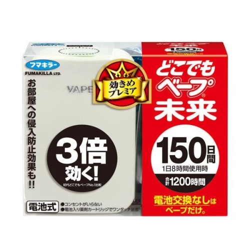 | 名称 フマキラー どこでもベープ未来150日セット パールホワイト 内容量 1個 商品説明 ●150日間※、電池・薬剤の交換なし! ※1日8時間使用時 最新のエコドライブシステムの採用により、虫の気になるシーズンを通して使用できます。途中で電池を取替える必要はありません。 ●効力が大幅にアップ! 特殊カートリッジで薬剤を効率よく拡散、さらに自社開発の特殊ファンとモーターの力で、電池式3個分の効力を実現しました。(初代どこでもベープNo.1比較) ●取替えは一度でカンタン! 電池の切れたときが薬剤の取替えどき。電池・薬剤一体型カートリッジだから、交換が一度で済み、装着もワンタッチでできます。 ●家中どこでも使える! コンセントがいらない電池式だからどこでも自由に置けます。すぐれた静音設計で、寝室に置いてもファンの音が気になりません。 適用害虫:ユスリカ、チョウバエ 発売元、製造元、輸入元又は販売元、消費者相談窓口 お問い合わせ先 電話番号:0077-788-555 受付時間:9:00〜17:00(土・日・祝および弊社指定休業日を除く) |