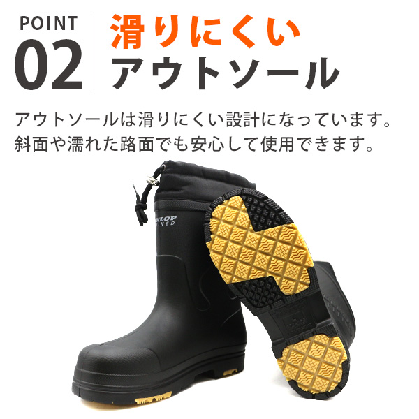 アウトソールは滑りにくい設計になっています。斜面や濡れた路面でも安心して使用できます。