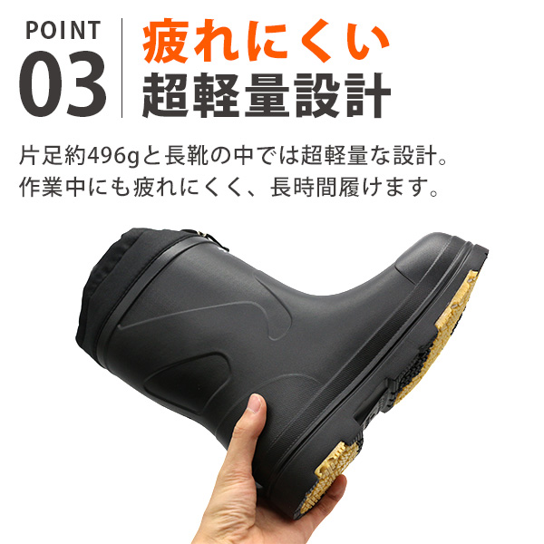 片足約496gと長靴の中では超軽量な設計。作業中にも疲れにくく、長時間履けます。