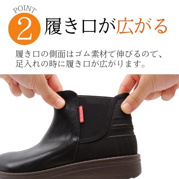 履き口の側面にはゴム素材で伸びるので、足入れの時に履き口が広がります。