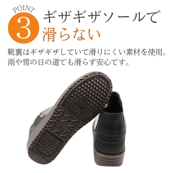 靴裏はギザギザしていて滑りにくい素材を使用。雨や雪の日の道でも滑らず安心です。
