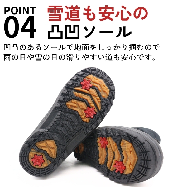 凹凸のあるソールで地面をしっかり掴むので雨の日や雪の日の滑りやすい道も安心です。